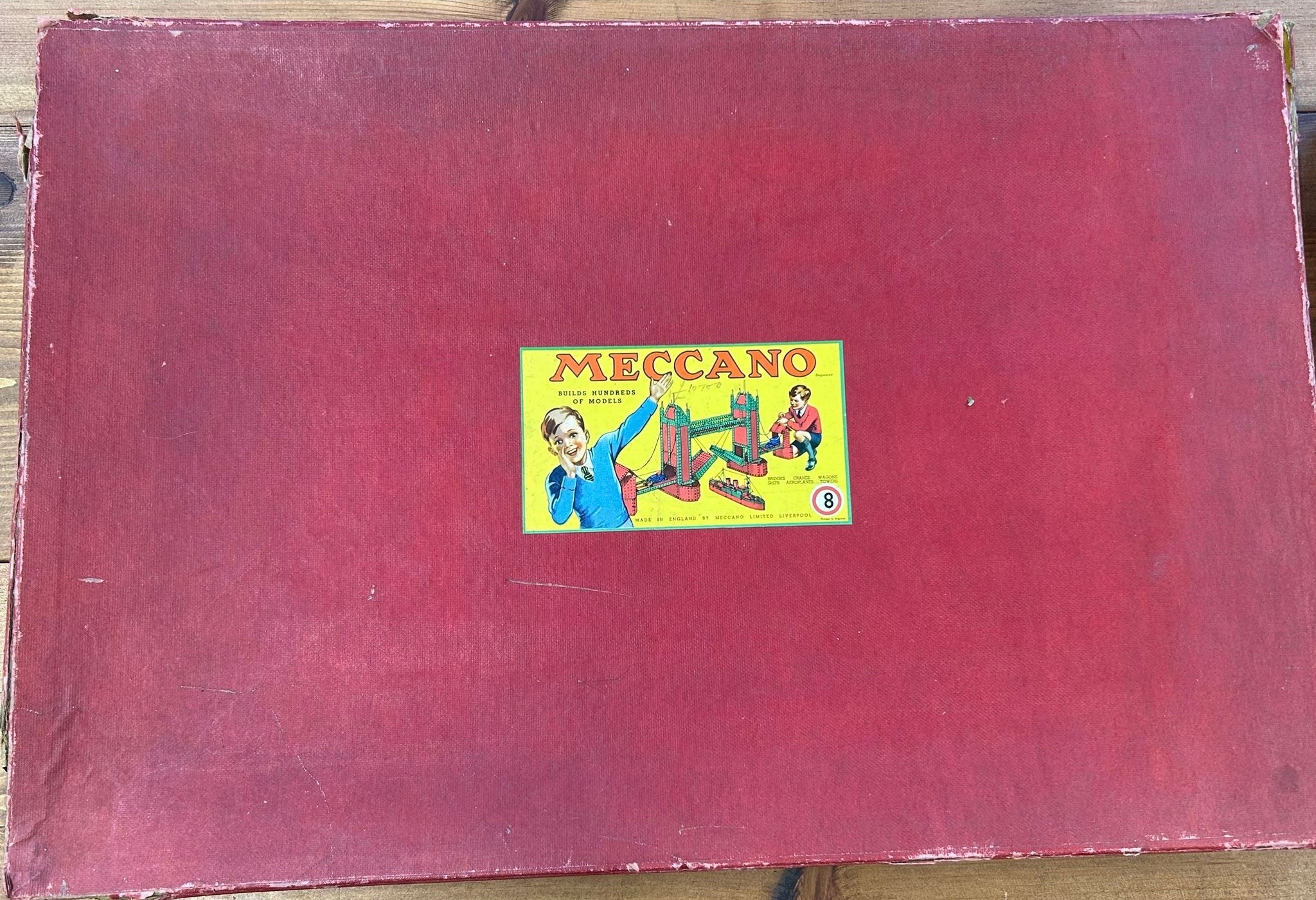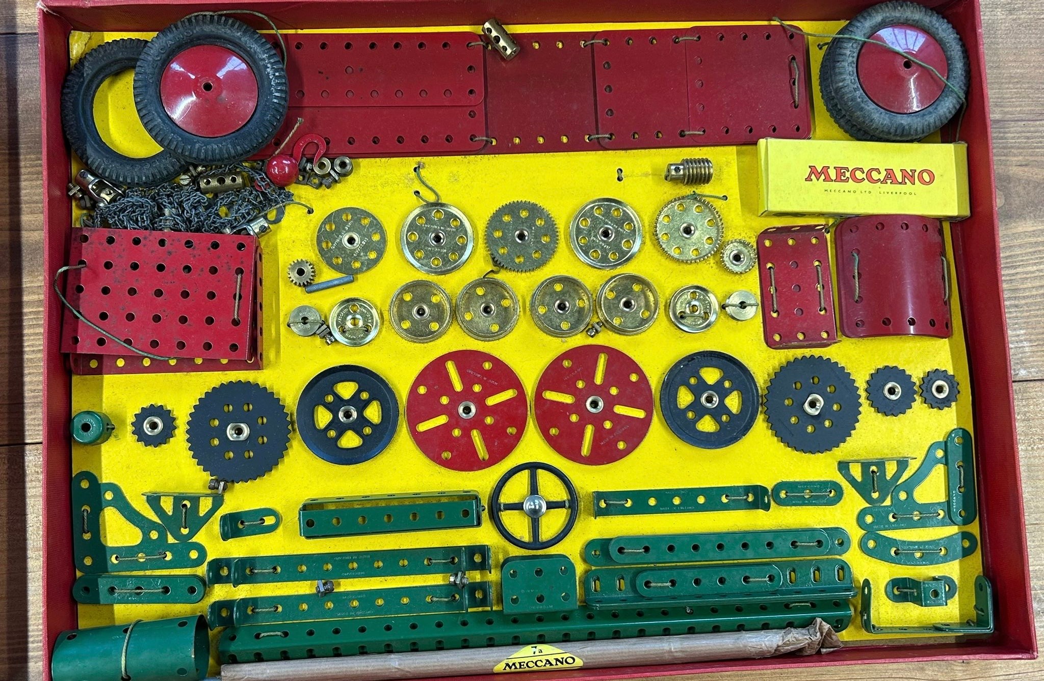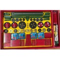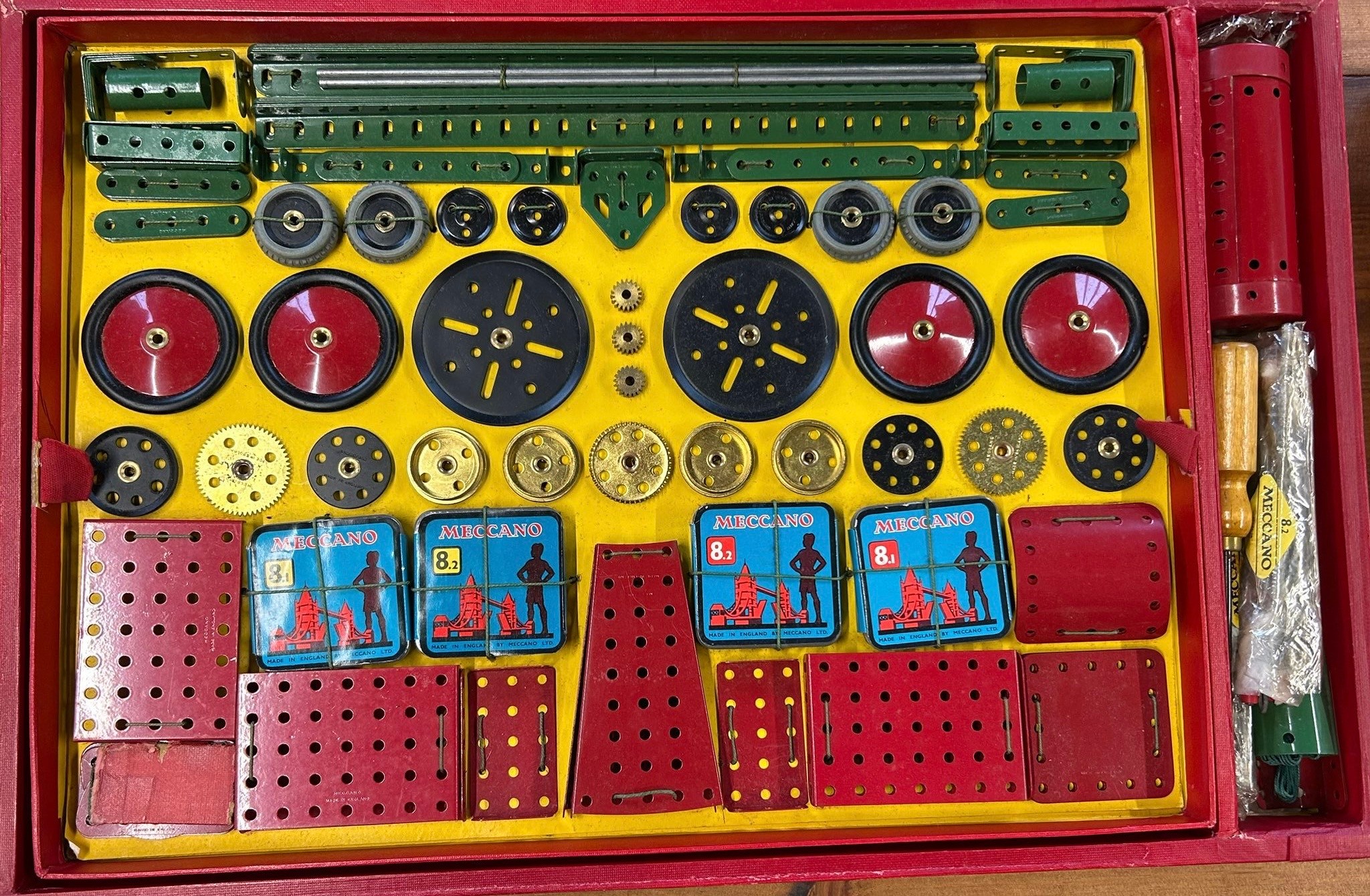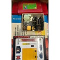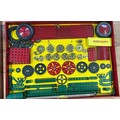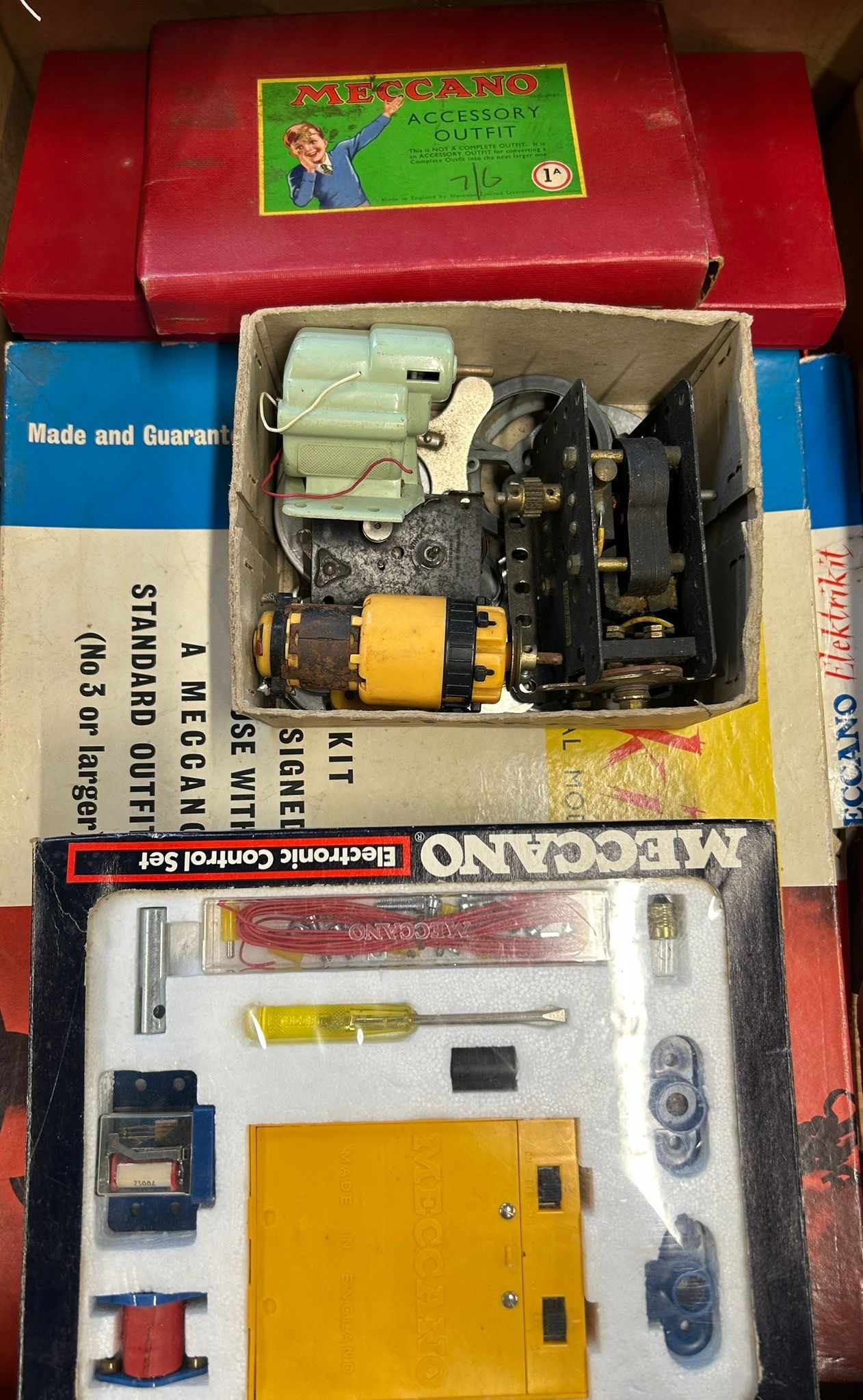 A quantity of 1950's Meccano. Large set No.8 still tied onto the original backing card. Large Accessory Outfit No.7 also tied in. Plus Accessory Outfit No.1A and 2A. Plus later items from the 1960's-70's - 2 Elektrikit sets, one unused and still sealed. Also an Electronic Control Set and a pack of Meccano gears. All boxed, some age wear. Contents to most GC-Mint, some maybe missing to one Elektrikit set. Also a box of used electric motors, a lose clockwork and lose circular parts. GC
