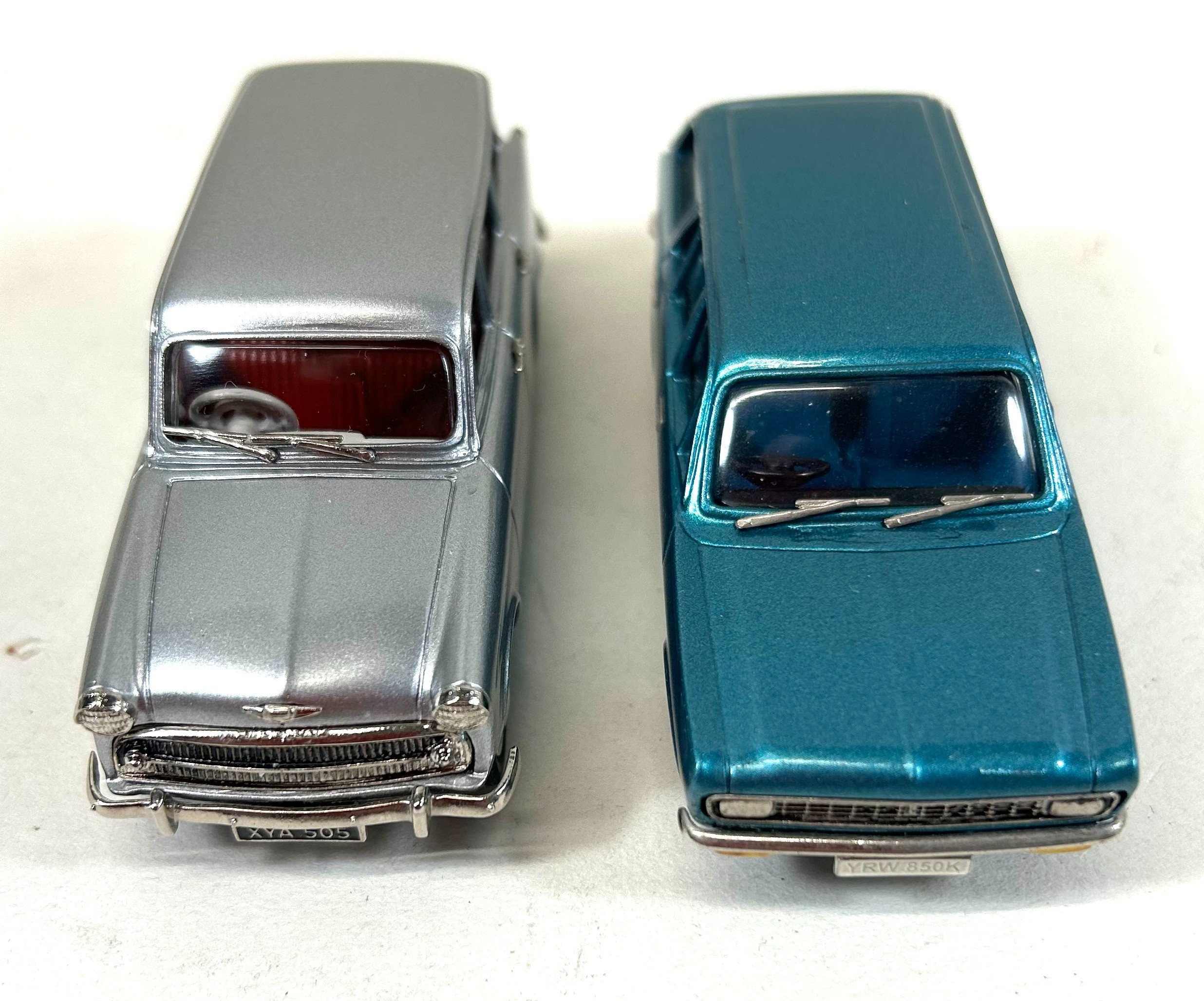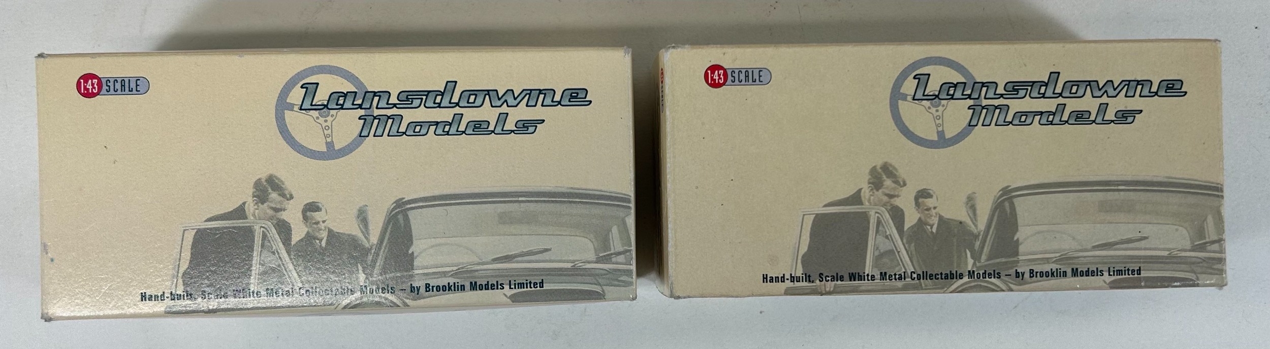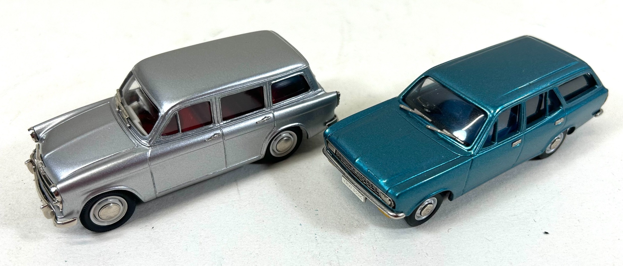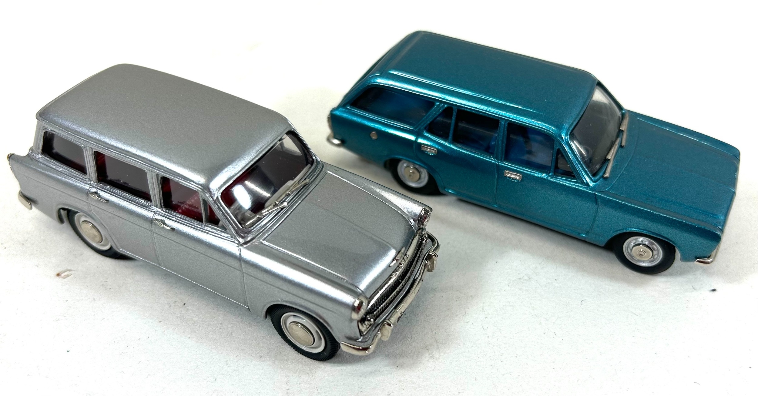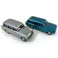 2 Lansdowne Models white metal models. LDM.54 1972 Hillman Avenger Deluxe Estate 'Aquarius Blue Metallic' Plus a LDM.88 Hillman Minx Estate Series I in metallic silver (Light Gun). Both boxed, with packing. Contents Mint, as new.