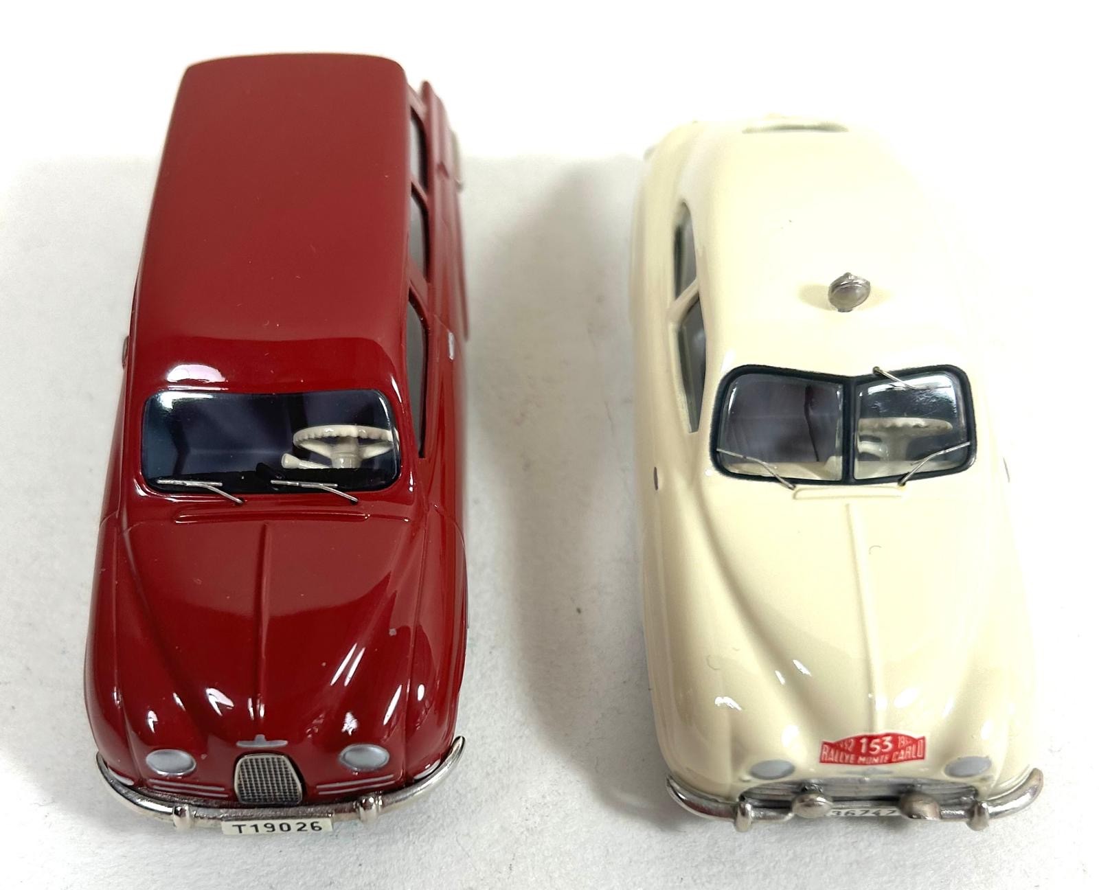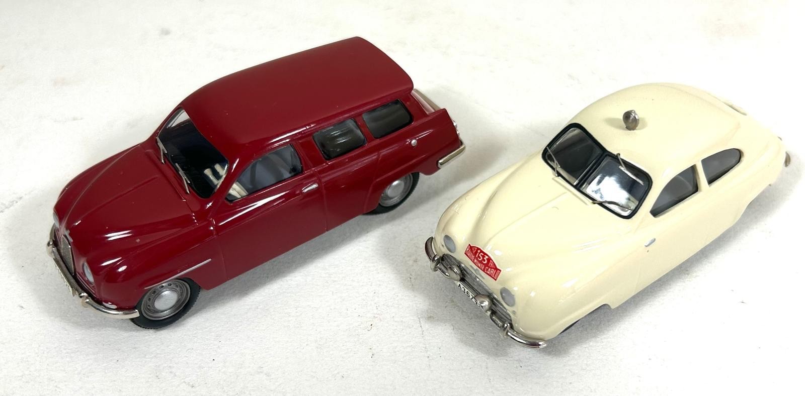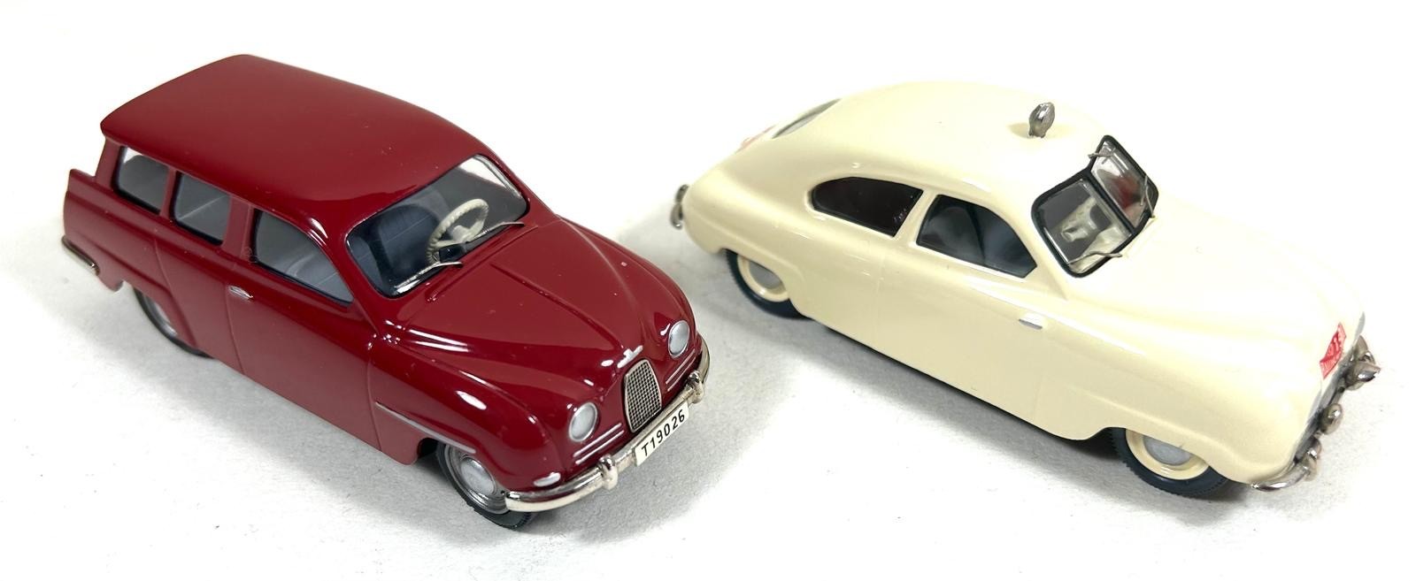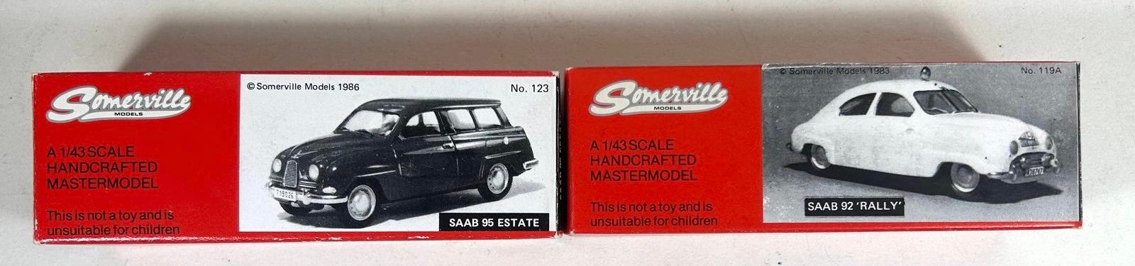 2 Somerville Models. 119A 1952 SAAB 'Rally' in cream Rally Monte Carlo livery. Plus a SAAB 95 Estate in red with grey interior. Both boxed, minor wear to one. Contents Mint.
