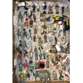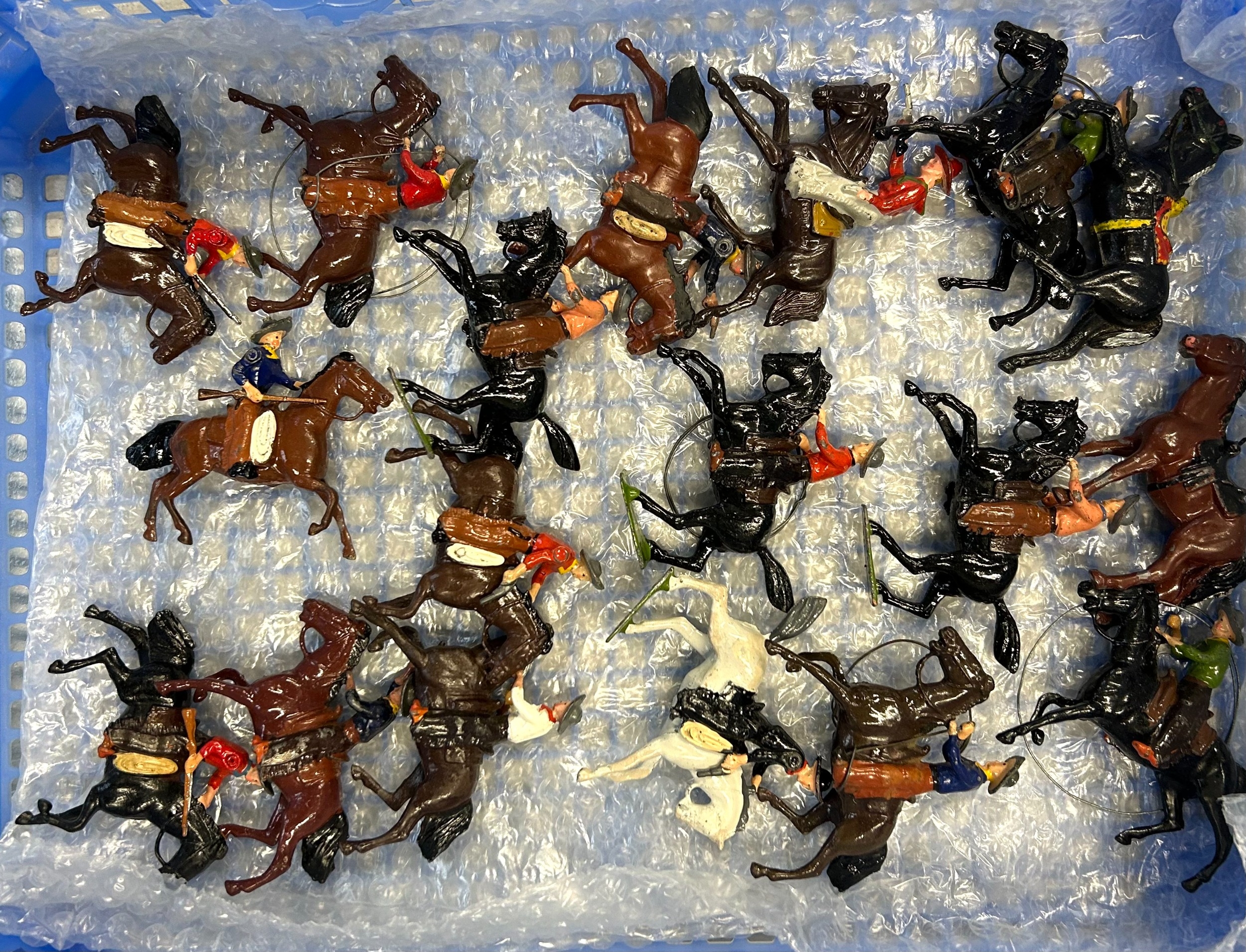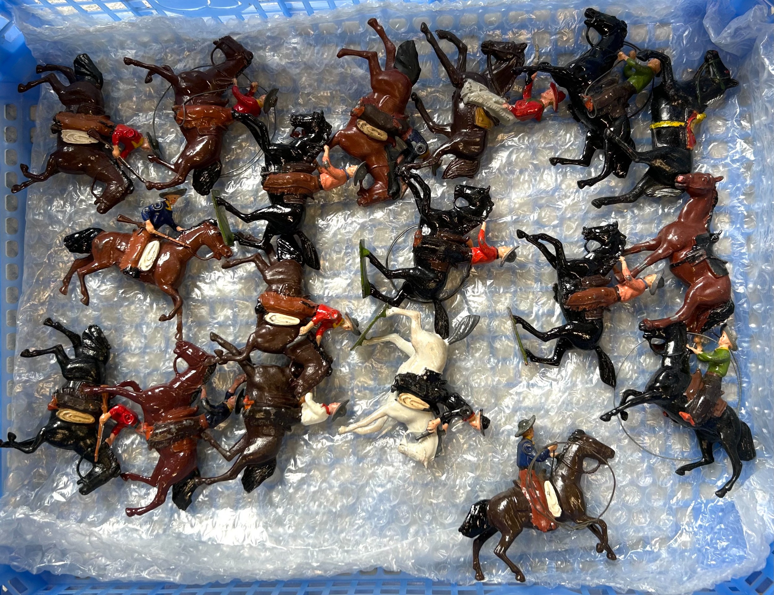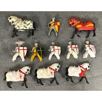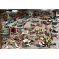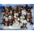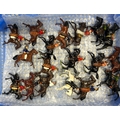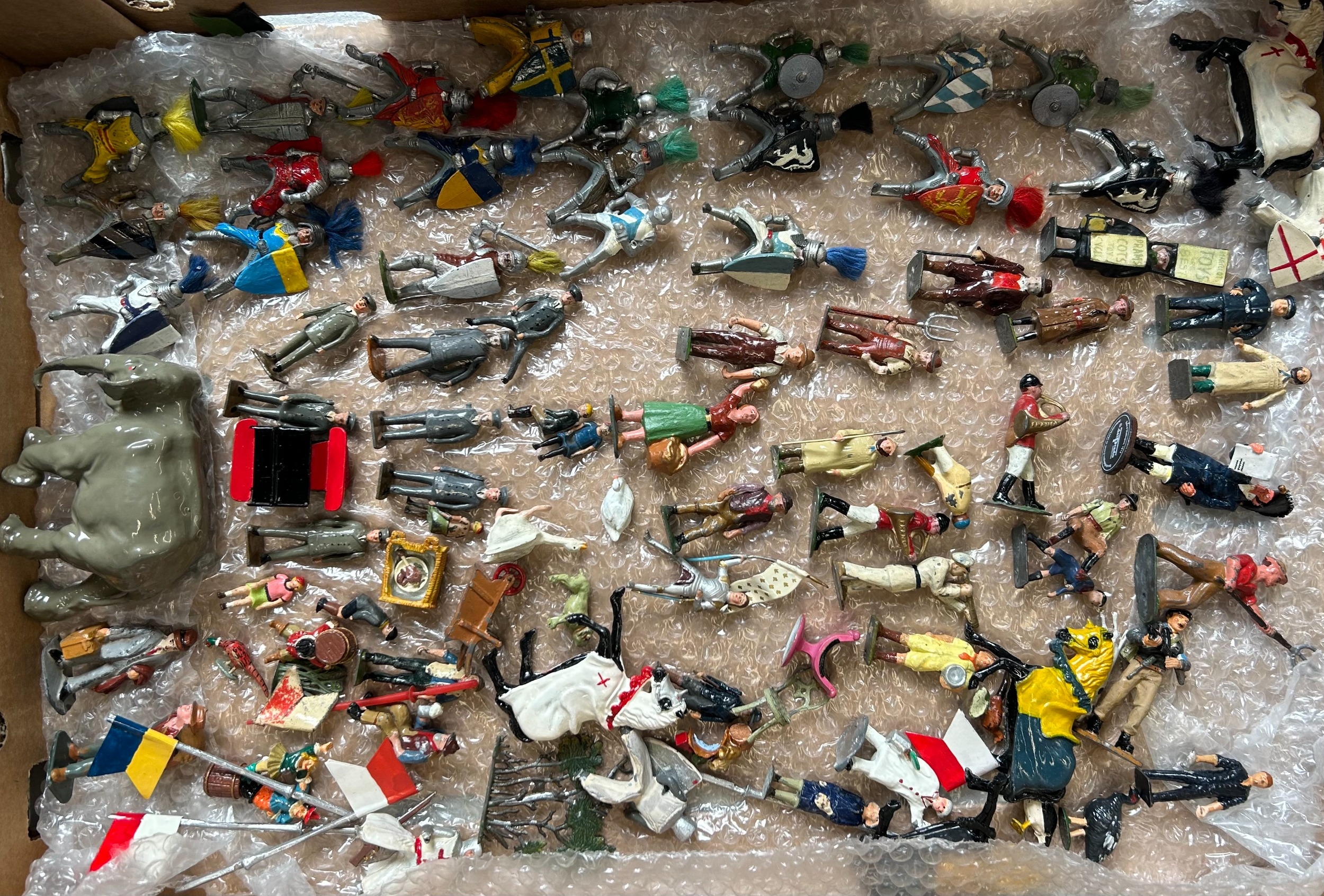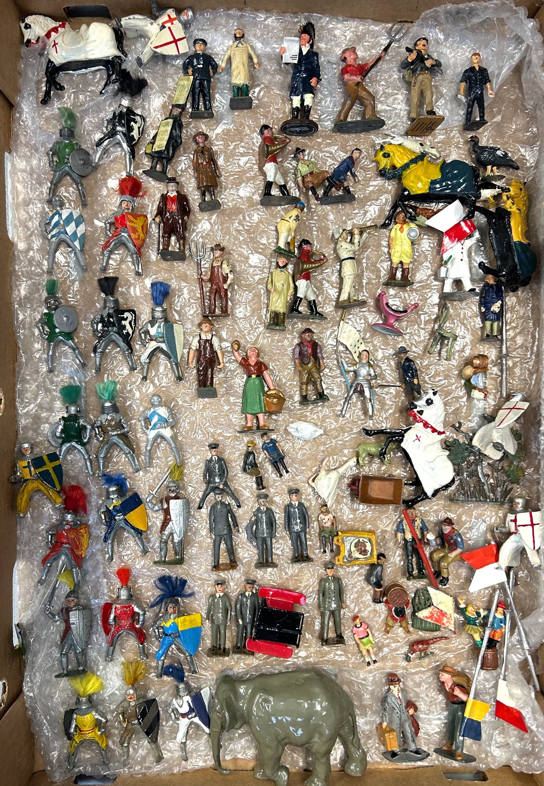 A quantity of lead figures mainly BRITAINS, includes Howdah with Elephant, keeper, and figures, mounted Cowboy figures, farmer, cricketers, civilian, and knights and others. Some might have repainting, parts missing or broken. GC-VGC £40-60