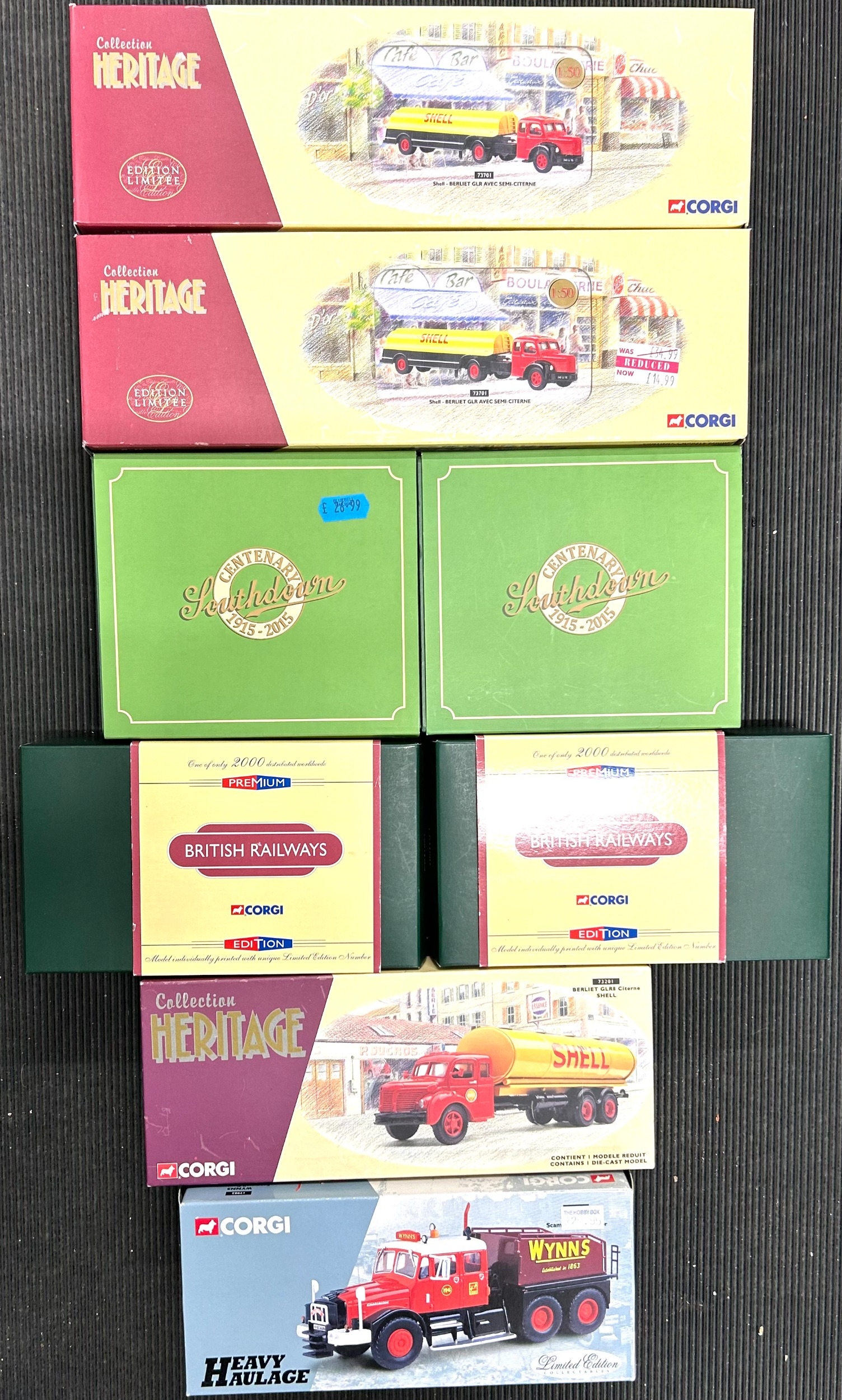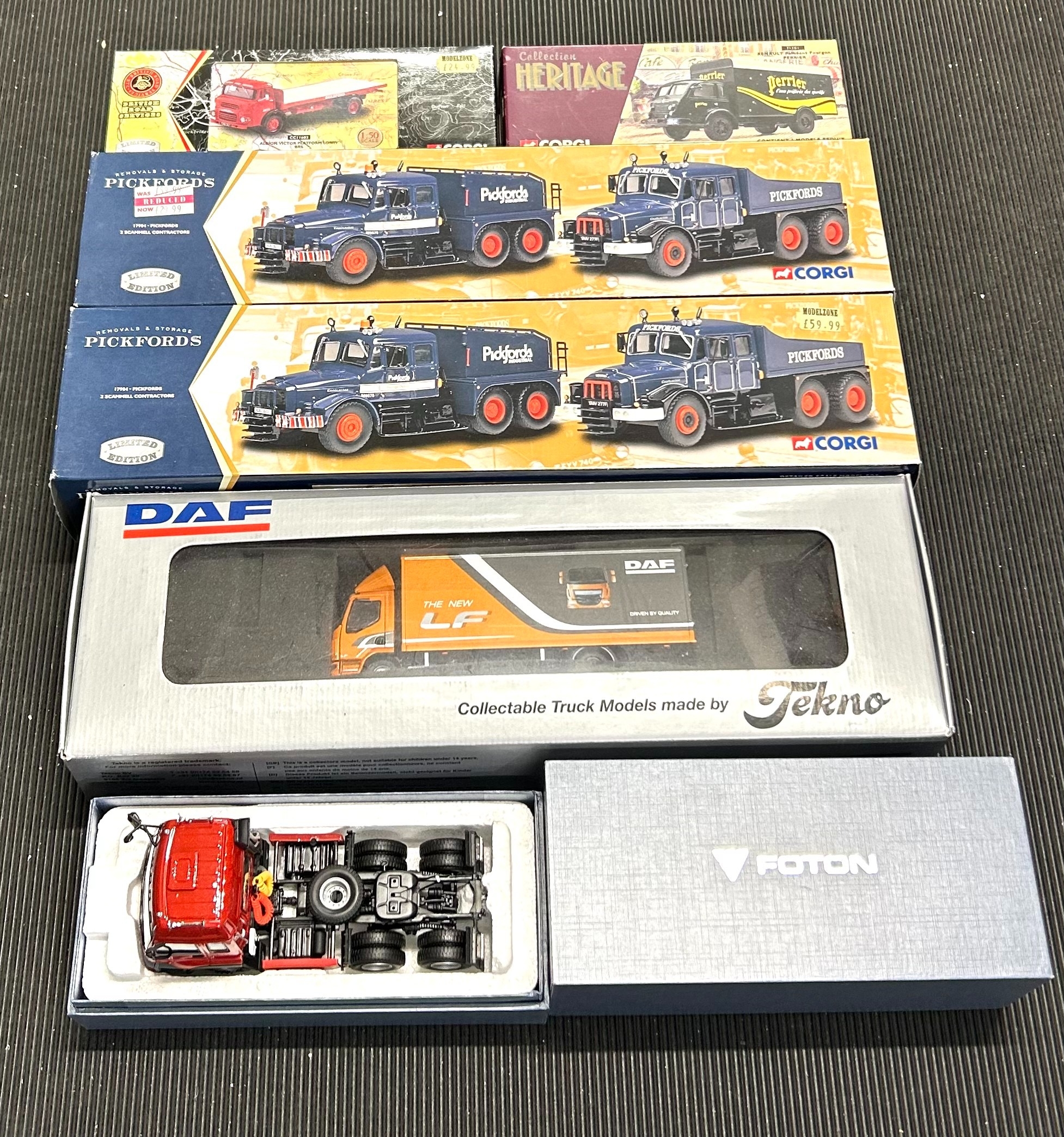 Quantity of mostly Corgi Classis, Corgi Heritage, Oxford etc. 2x Pickfords 2 vehicle Scammell Contractor sets. Heavy Haulage Scammell Contractor Wynns. Albion Victor Platform Lorry, BRS. 2 Thames Trader Flatbed, British Rail. 4 Corgi Heritage French issue - 2x Berliet GLR with semi trailer, SHELL. Berliet GLR8 Citerne SHELL. Renault Fougon, Perrier. Plus 2 Oxford 2 vehicle Southdown Centenary Sets. Tekno DAF LF Truck, DAF livery. Plus a FOTON 3 axle tractor unit. All boxed. Contents VGC-Mint. (14)