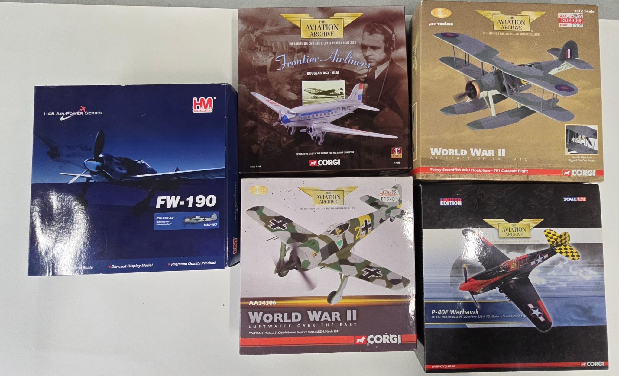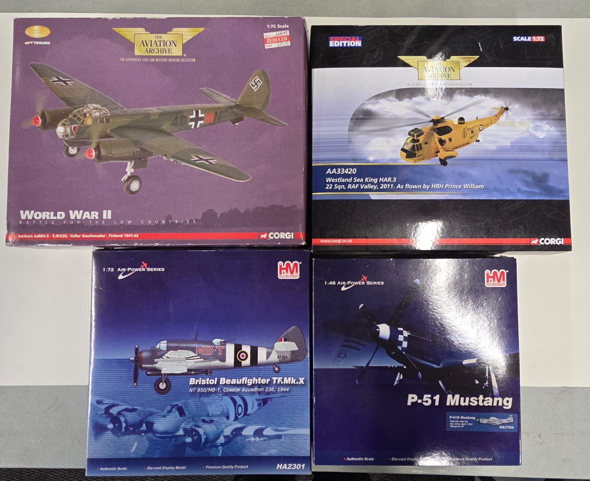4 CORGI AVIATION ARCHIVE, to include Westland sea king HAR.3, WW2 Junkers Ju88A-5 5./KG30 Adler Geschwader, Finland 1941-2, WW2 Fairey Swordfish, and a Douglas DC3-KLM, P-40F Warhawk, and a FW-190A- yellow 2, together with 3x HM (Hobby Masters),Bristol Beaufighter, P-51 Mustang, and a FW-190. All boxed, not checked for completness. Some minor wear to boxes. GC-VGC £70-90
