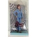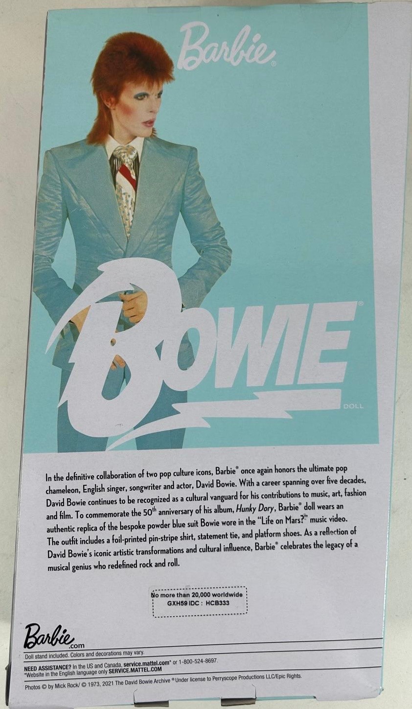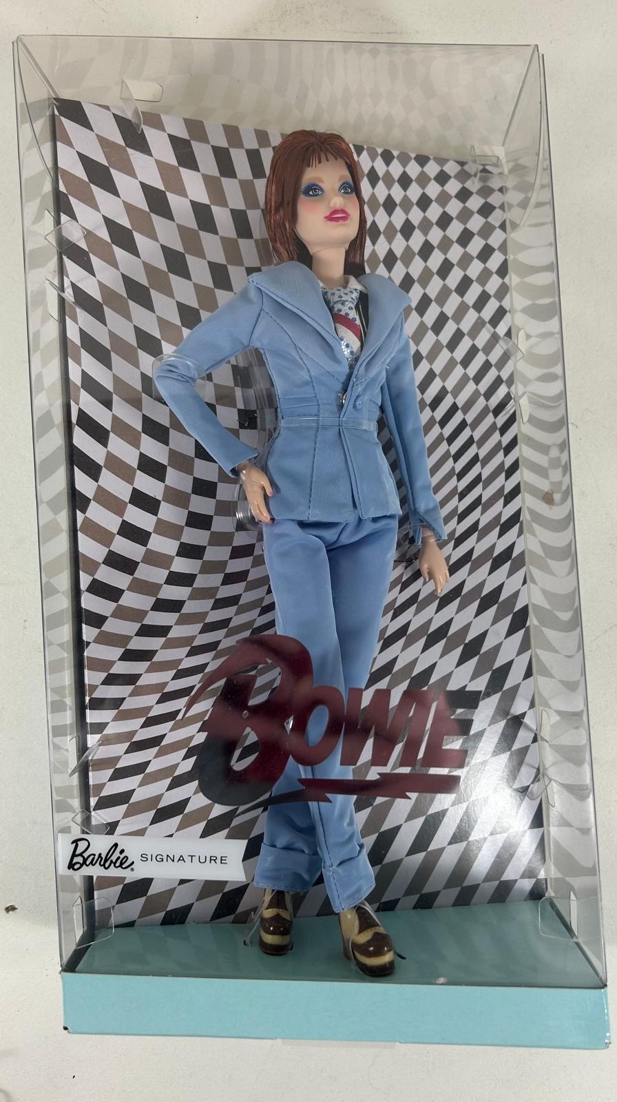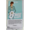 A scarce Mattel Barbie signature David 'BOWIE' figure. A Special edition produced in 2021. The figure is dressed in a mid blue trouser suit with a foil printed black/silver striped shirt with a multi coloured statement tie and platform shoes. Boxed. Unused. Mint