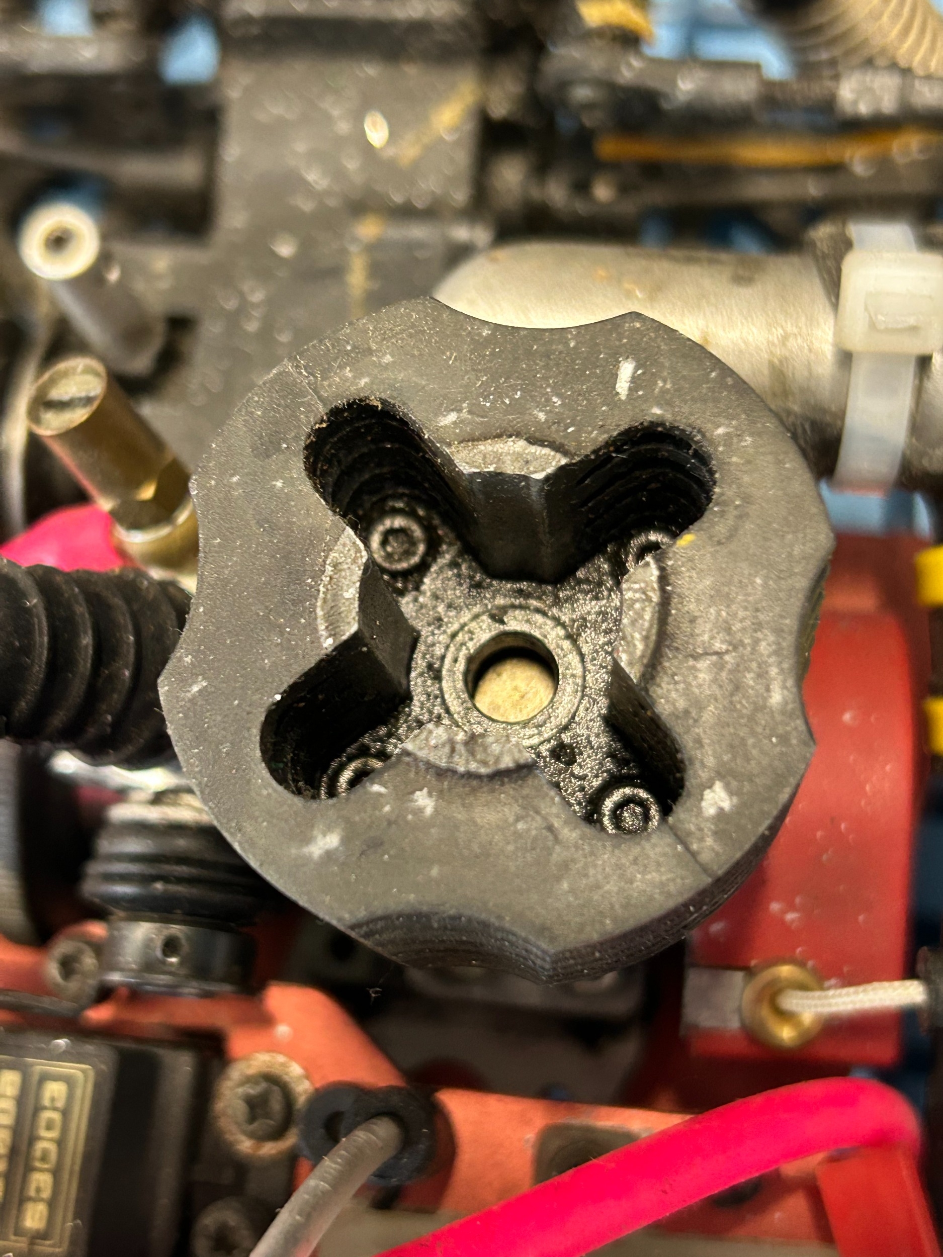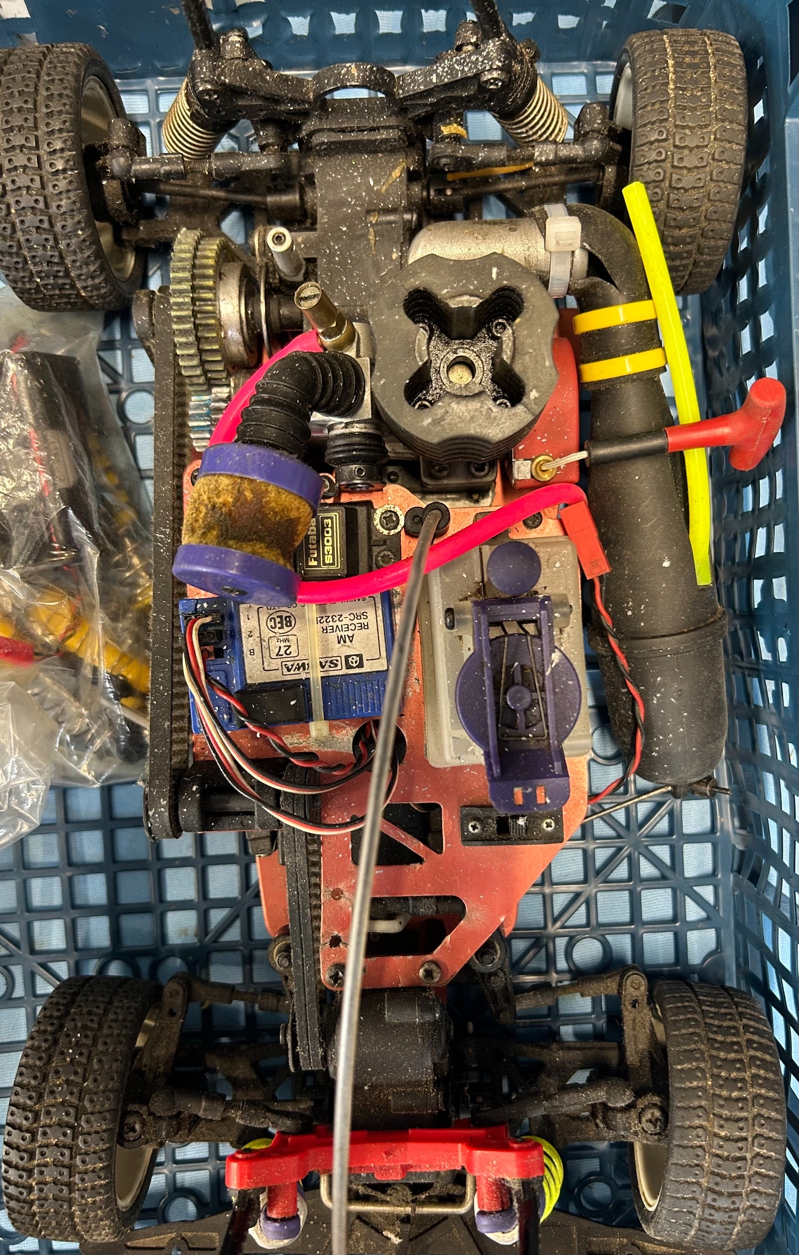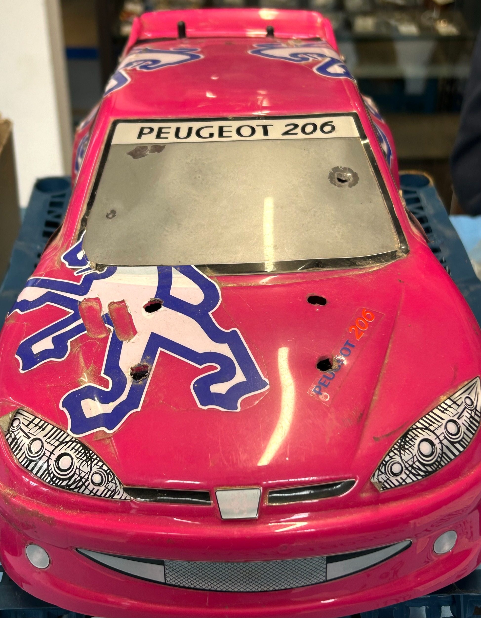 A fuel driven Radio controlled model of a PEUGEOT 206 Rally car, has a vacuum formed pink body with Auto Trader labels to the doors, has a pull cord start, some damage to the engine, so this is sold as a non runner. Comes with a small bag of replacement springs and other parts. GC £30-50