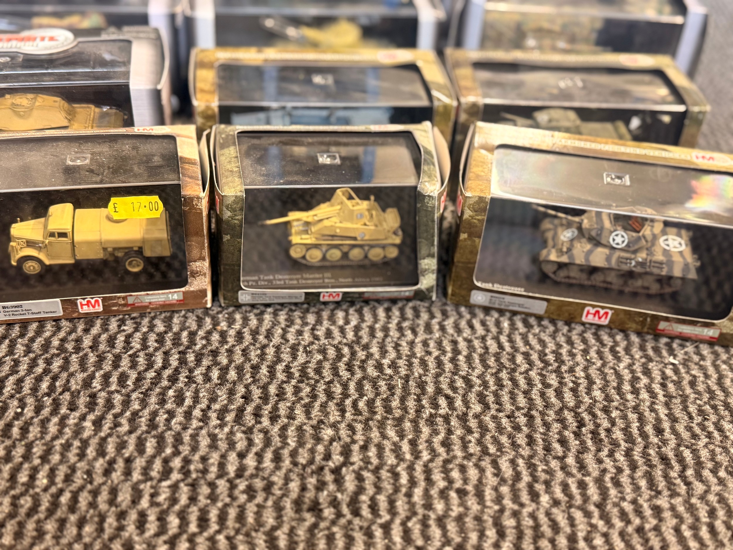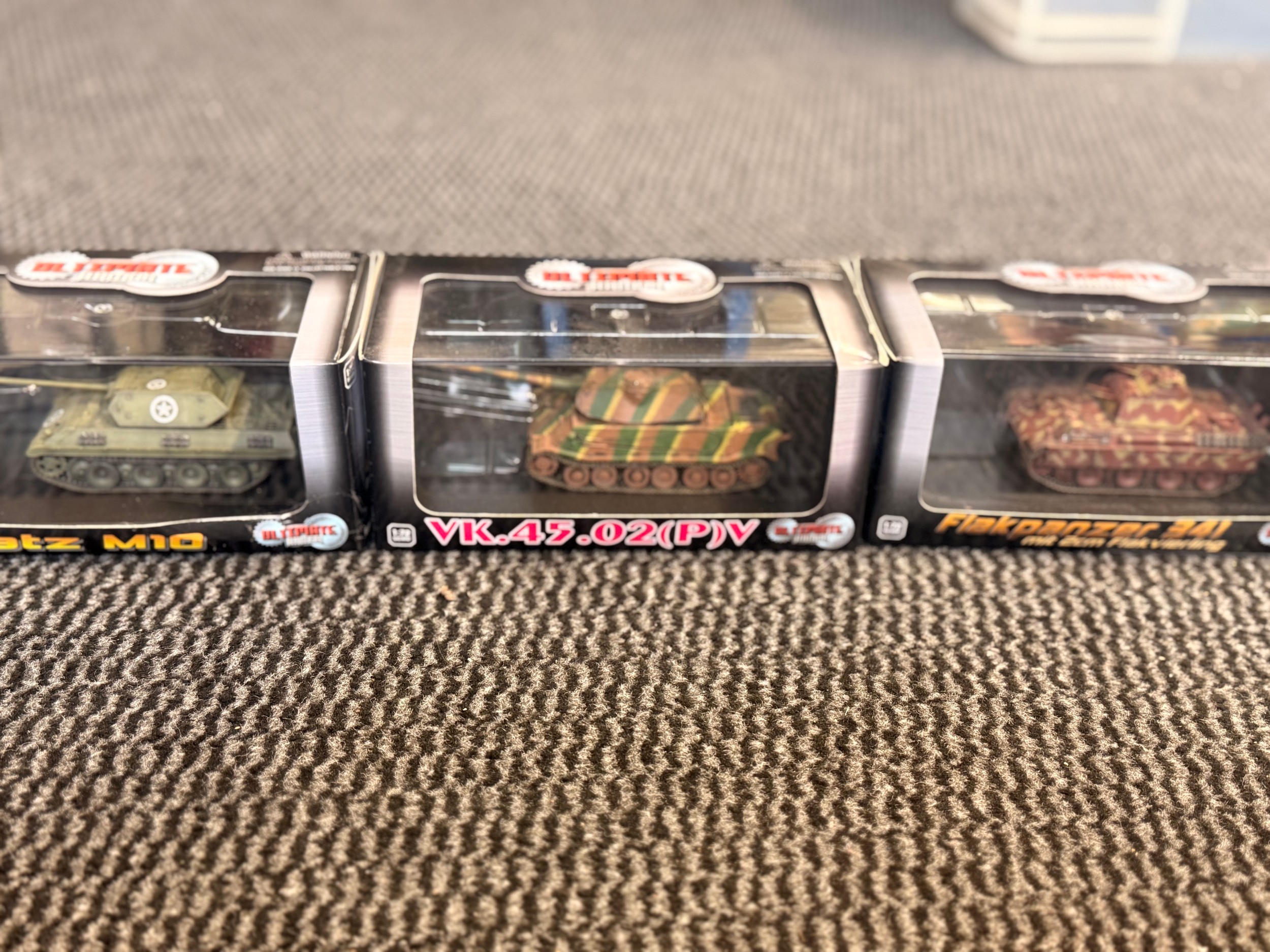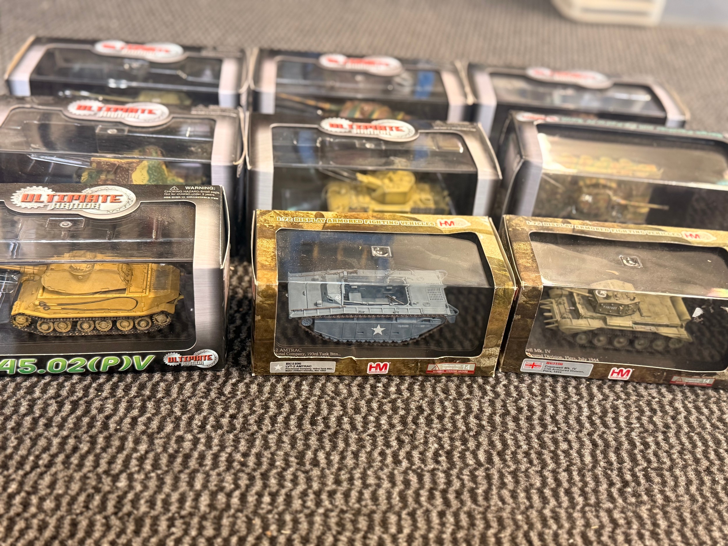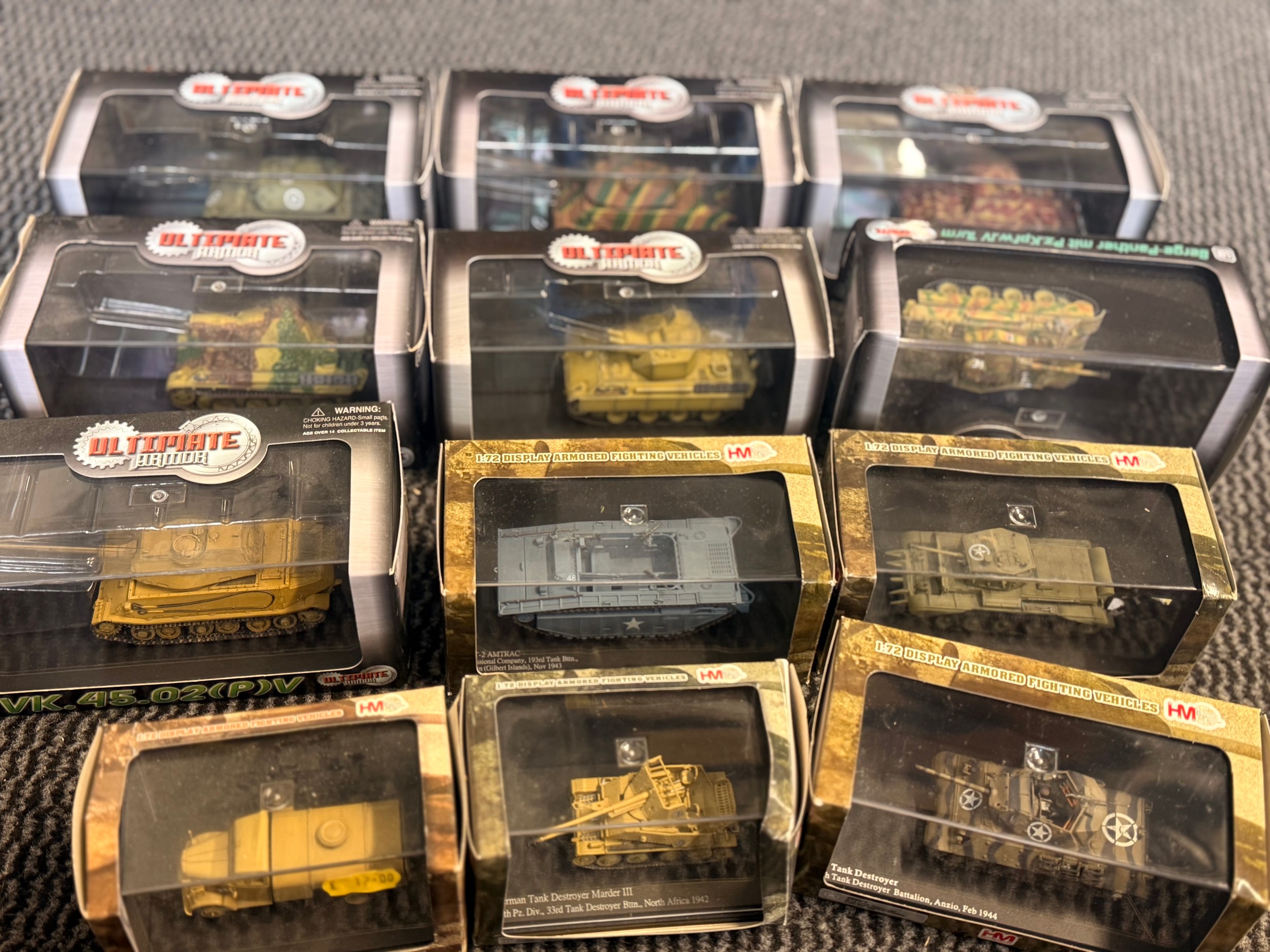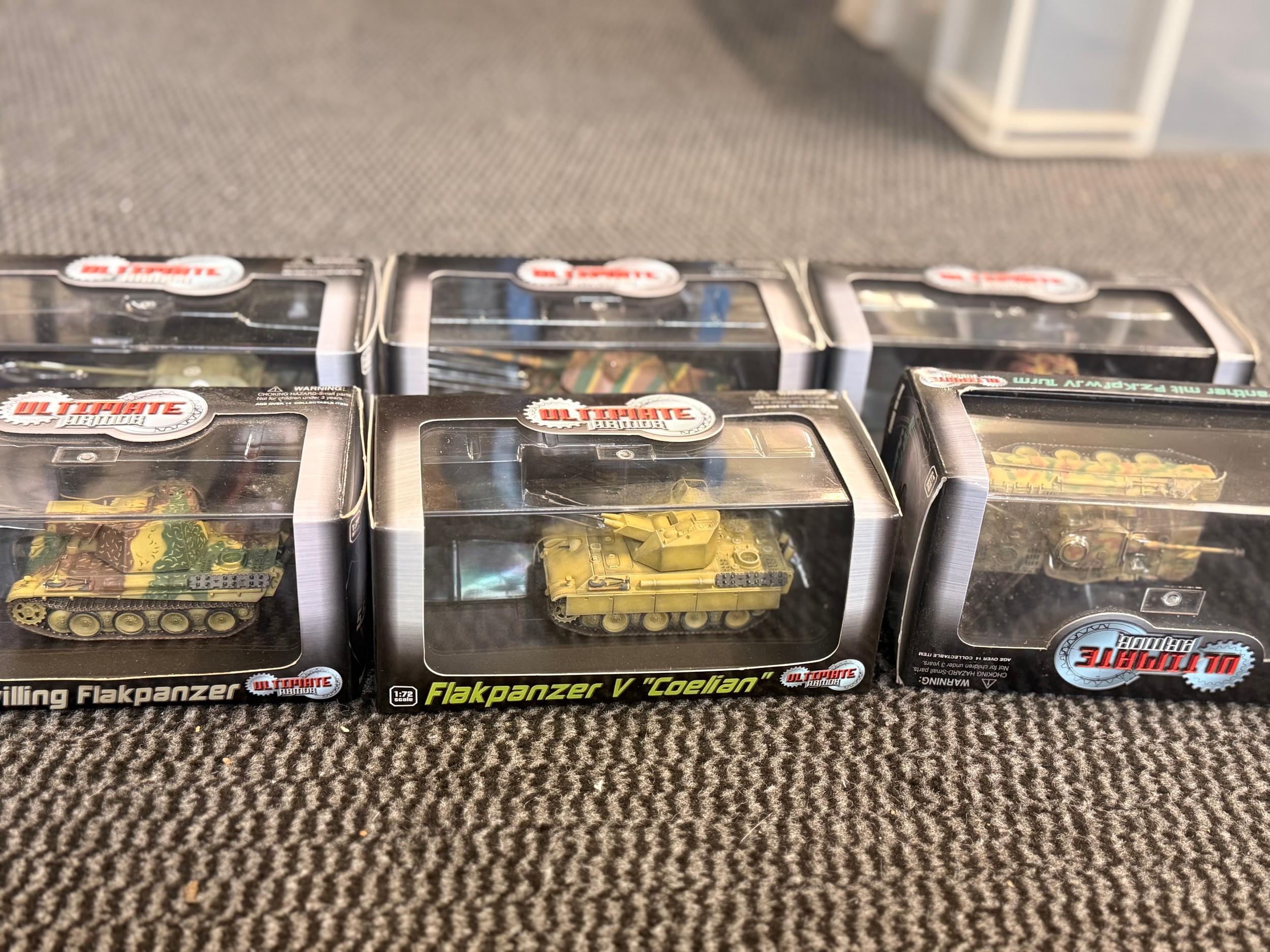 10 ULTIMATE ARMOUR 1:72 scale model tanks. to include, VK.45.02 (P)V, FLAKPANZER V "COELIAN", 5.5cm ZWILLING FLAKPANZER, BERGE-PANZER MIT PZ.KPFW.1V TURM, FLAKPANZER 341, and others, also includes 2 HM Hobby Masters) GERAN TANK DESTROYER ARDER 111, and M10 TANK DESTROYER. All in plastic display packs with card sleeves. Some minor wear. VGC-MINT £50-70