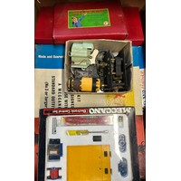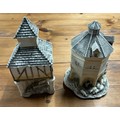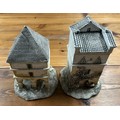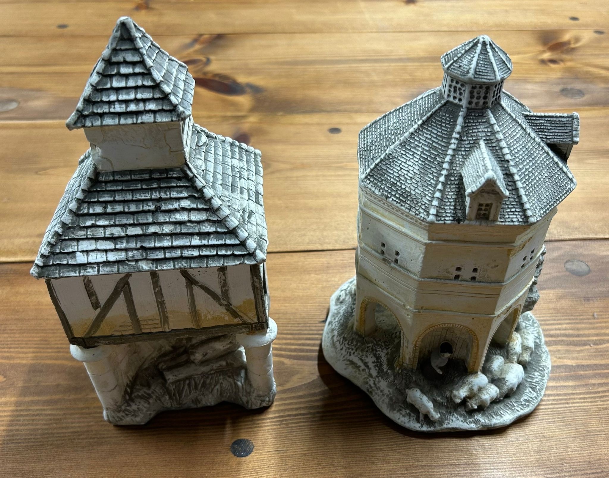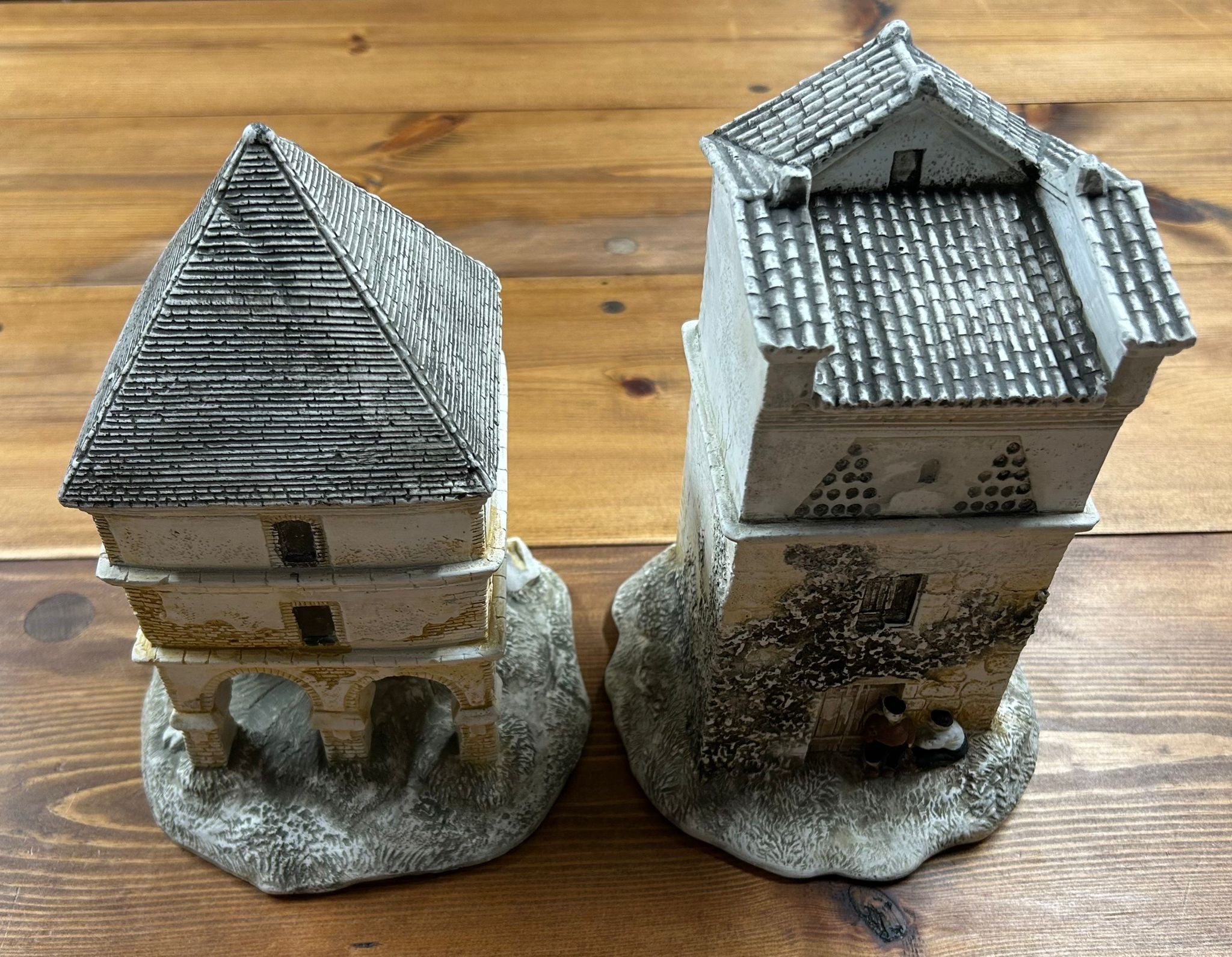 4 impressive traditional French style pottery/plaster 'Decore a La Main' Medieval style countryside buildings. Town house, 2 arched towers, and a market building with dove cote tower. Finley detailed models. Average height 23cm. VGC