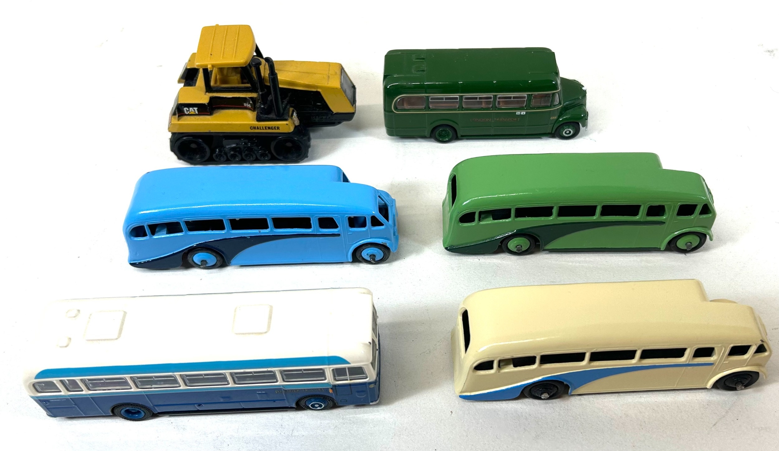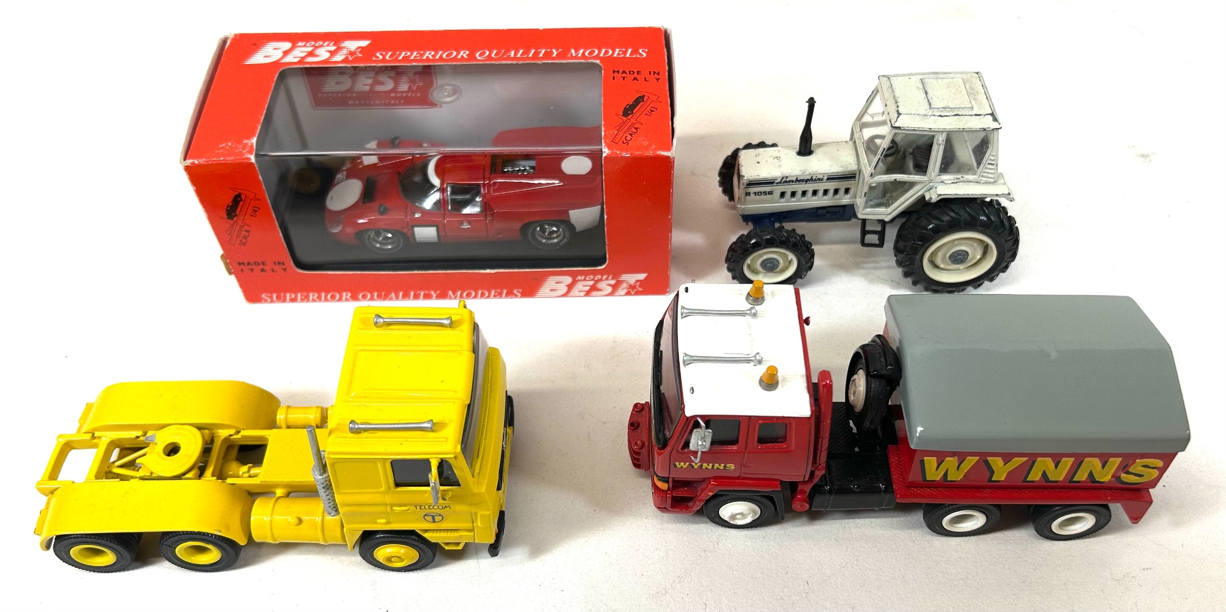 11 Various Makes. 2 white metal tractor units produced by ASAM Models - a Foden S104 3 axle, in yellow BT Telecom livery. Plus a Scammell S26 3 axle Heavy Tow Truck, 'Wynns'. A WSI Classics DAF 2800 3 axle tractor unit in orange and black. Best Model Lola T70 Coupe, 'Prova', boxed. CAT Challenger tracked tractor. 2 EFE- Guy GS, L.T. and a BET Bus, Premier. 3 well restored Dinky Single Deck Buses, in blue, cream and green livery. Also a Yaxon Lamborghini Tractor.