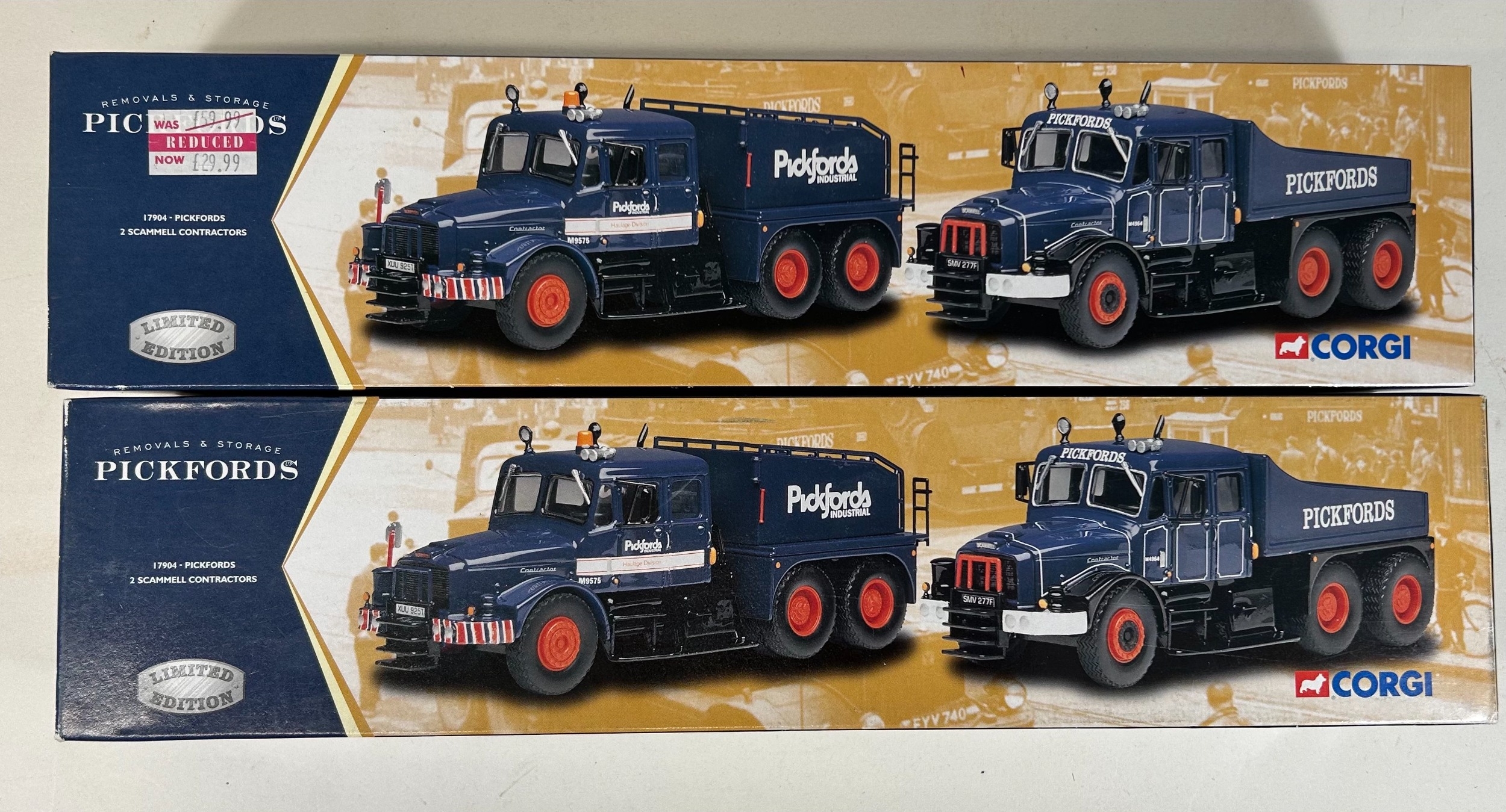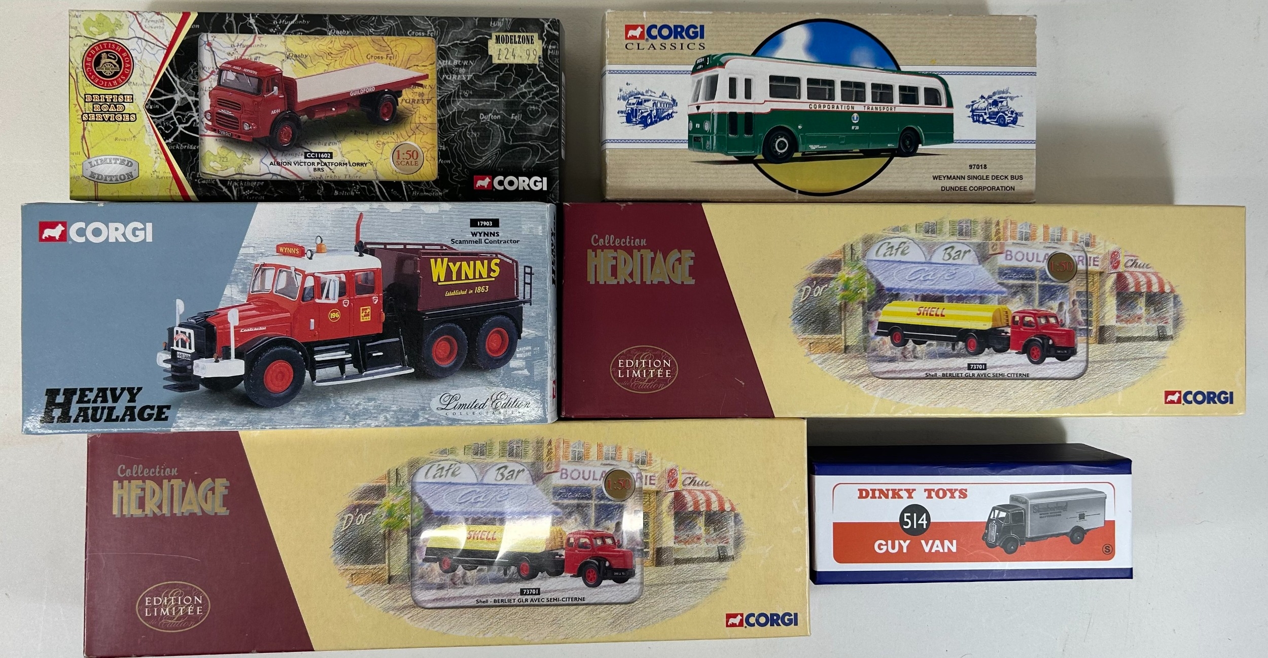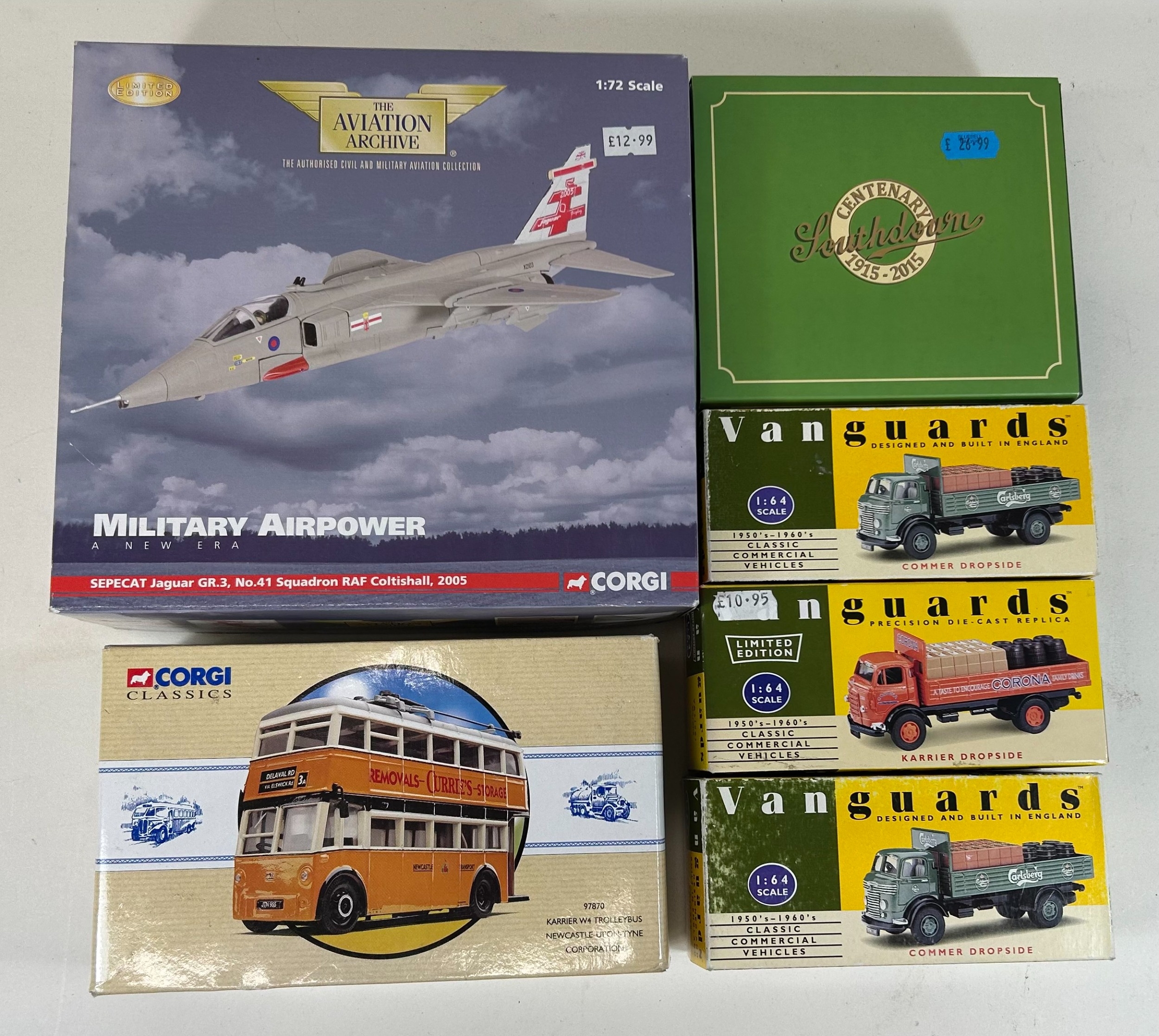 Quantity of mostly Corgi Classis, Corgi Heritage, Oxford etc. 2x Pickfords 2 vehicle Scammell Contractor sets. Heavy Haulage Scammell Contractor Wynns. Albion Victor Platform Lorry BRS. Weymann Single Deck BUs, Dundee. Plus a Karrier W4 Trolleybus, Newcastle. 4 Corgi Heritage French issue - 2x Berliet GLR with semi trailer, SHELL. Plus an Oxford 2 vehicle Southdown Centenary Set. Atlas Dinky Guy Van, Slumberland. 3x Vanguard - 2 Commer Dropside Lorries, Carlsberg. Plus a Karrier Dropside, Corona. Plus a Corgi Avaition SEPECAT Jaguar GR3 41sqn 2005. All boxed. Minor wear. Contents VGC-Mint, one missile lose but present to Jaguar.