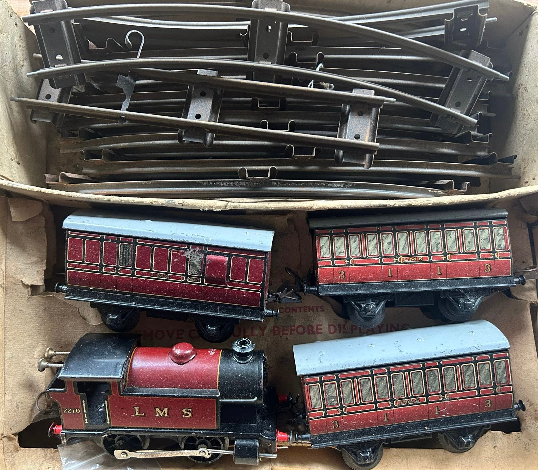 A collection of model railway. O guage clockwork LMS loco with 3 coaches, track in original box base only (no lid). Hornby oo guage locos and rolling stock, boxed and loose, together with a Dinky lorry, PLAYCRAFT train set (boxed), LIONEL LINES tender and 3 corriages (no loco), and other items. some boxed, also some damage and parts missing or broken. Conditions GC. £50-70