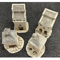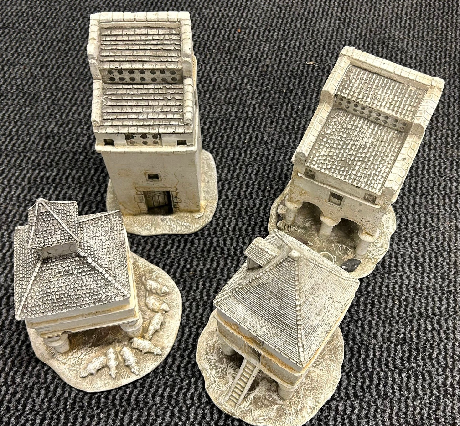 4 impressive traditional French style pottery/plaster 'Decore a La Main' Medieval style countryside buildings. In a variety of architectural styles including 2 stepped roofed examples, one on tall columns and a raised barn on pillars and another with grazing sheep to base. Finley detailed models. Average height 20cm. VGC