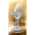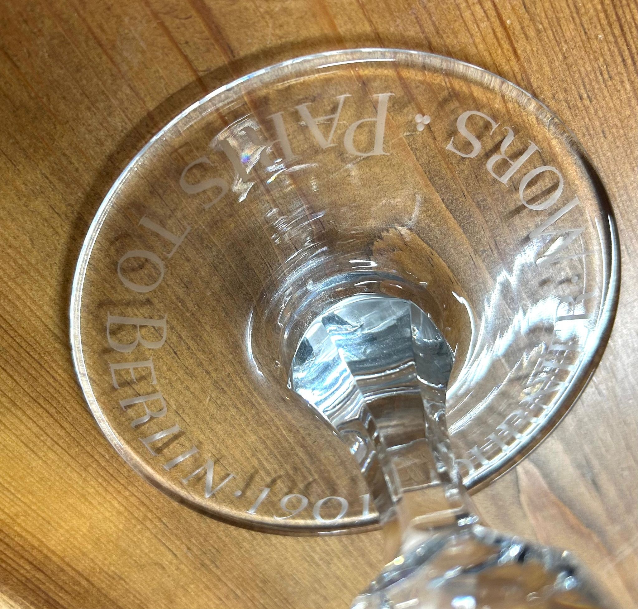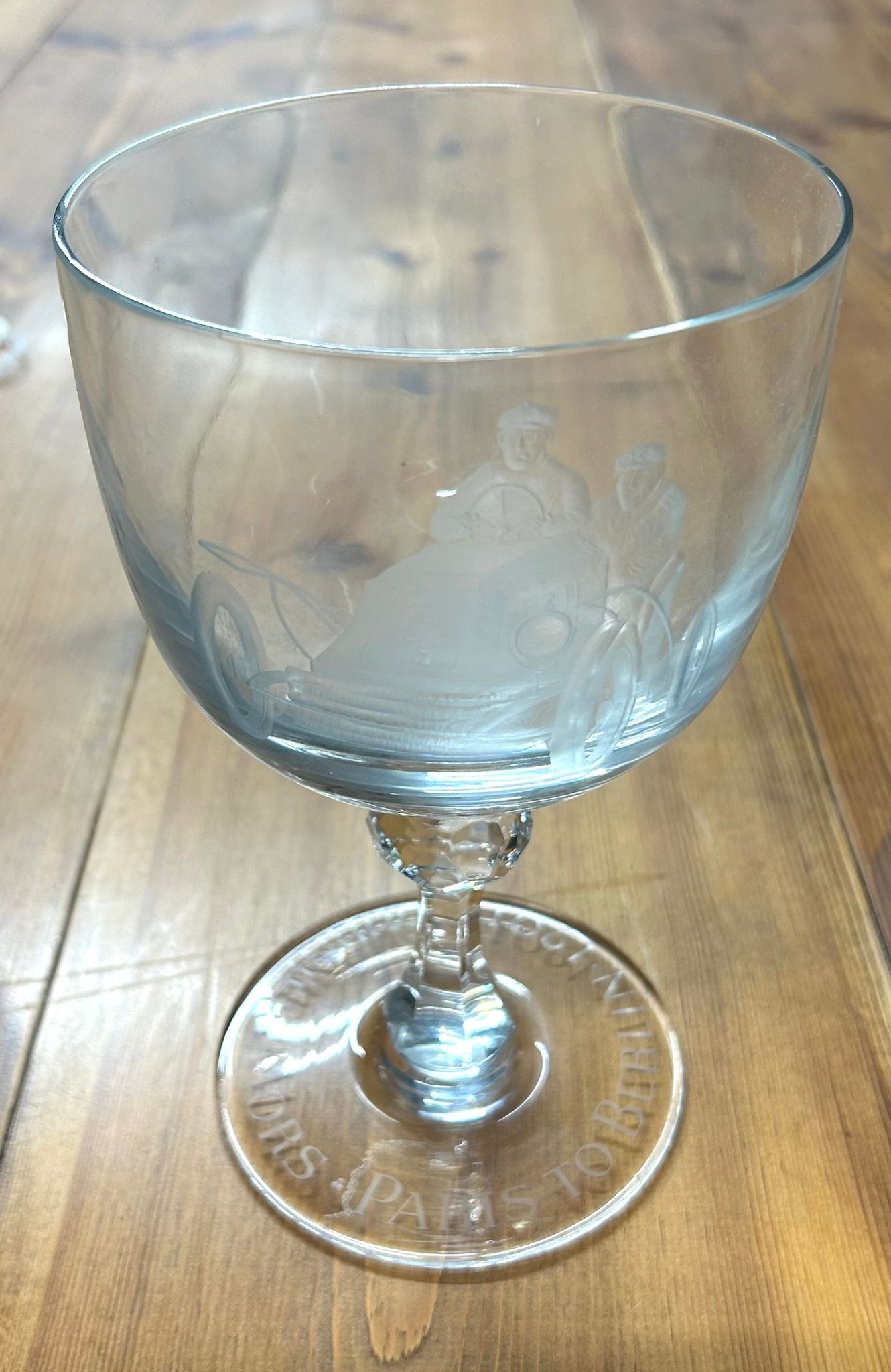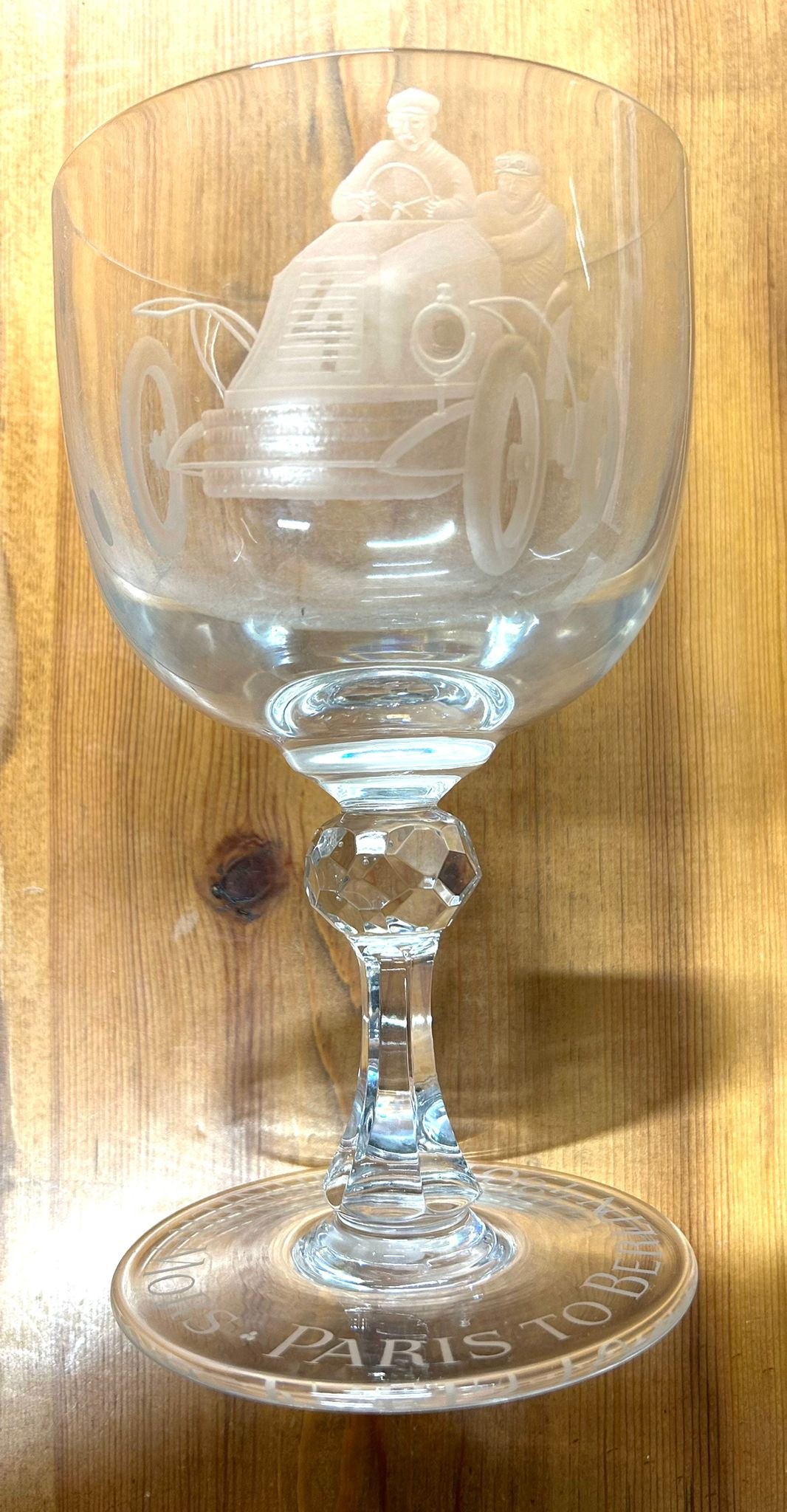 A very unusual and possibly a presentation large glass on stem, bowl of glass shows an acid etched picture of a vintage car with no.4 to the front. The base of the stem is engraved Paris-Berlin 1901 Fournier Mors. Vgc (Height 8" diameter 5").