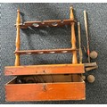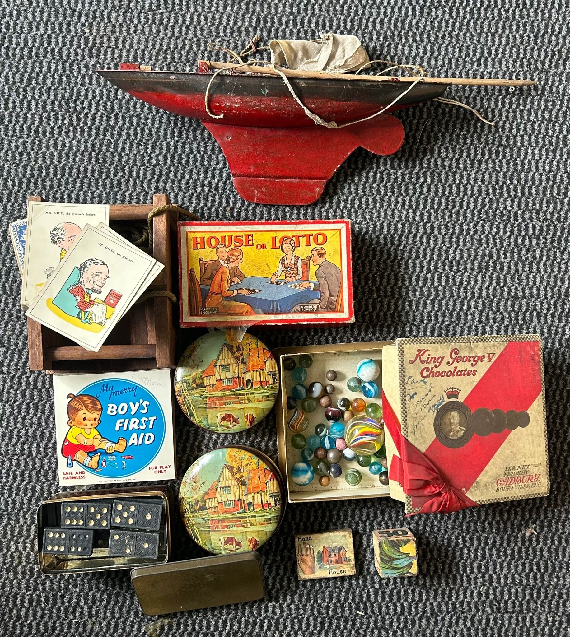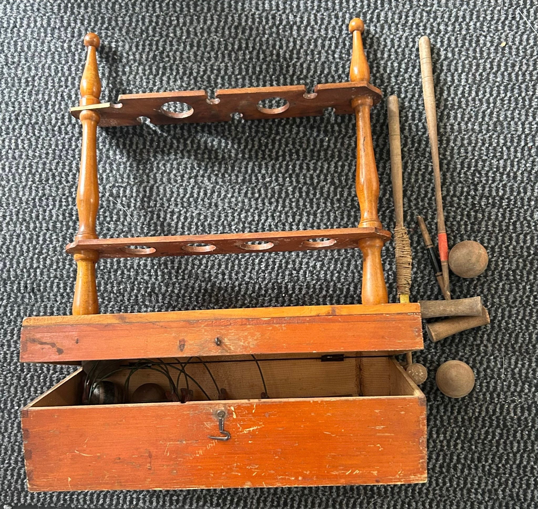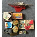 A collection of early games including a VERY UNUSUSAL table top Croquet set with a mahogany stand, Jungle shooting game, UBILDA Fort, Boys first aid kit, pond yacht, Glass marbles, playing cards and others. Some items boxed in poor boxes, cannot gaurantee anything is complete. (loft find). F -GC £80-120