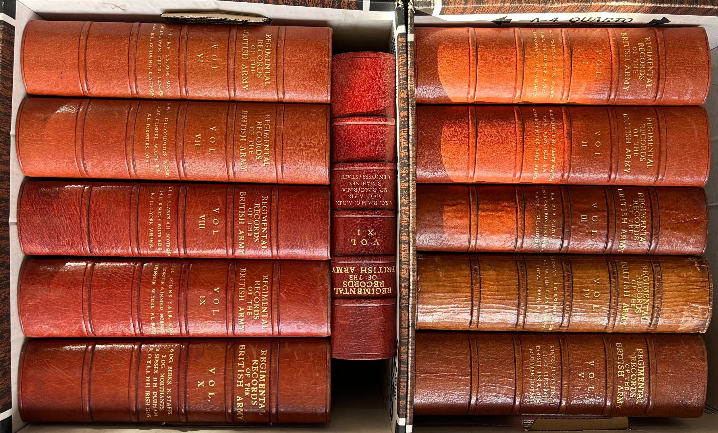 "Regiment Records of the British Army", consisting of 11 vols of cuttings, prints and photographs of records, uniforms badges and equipment of every regiment of the British Army, half leather bound with gilt spines listing the regiments included. VGC