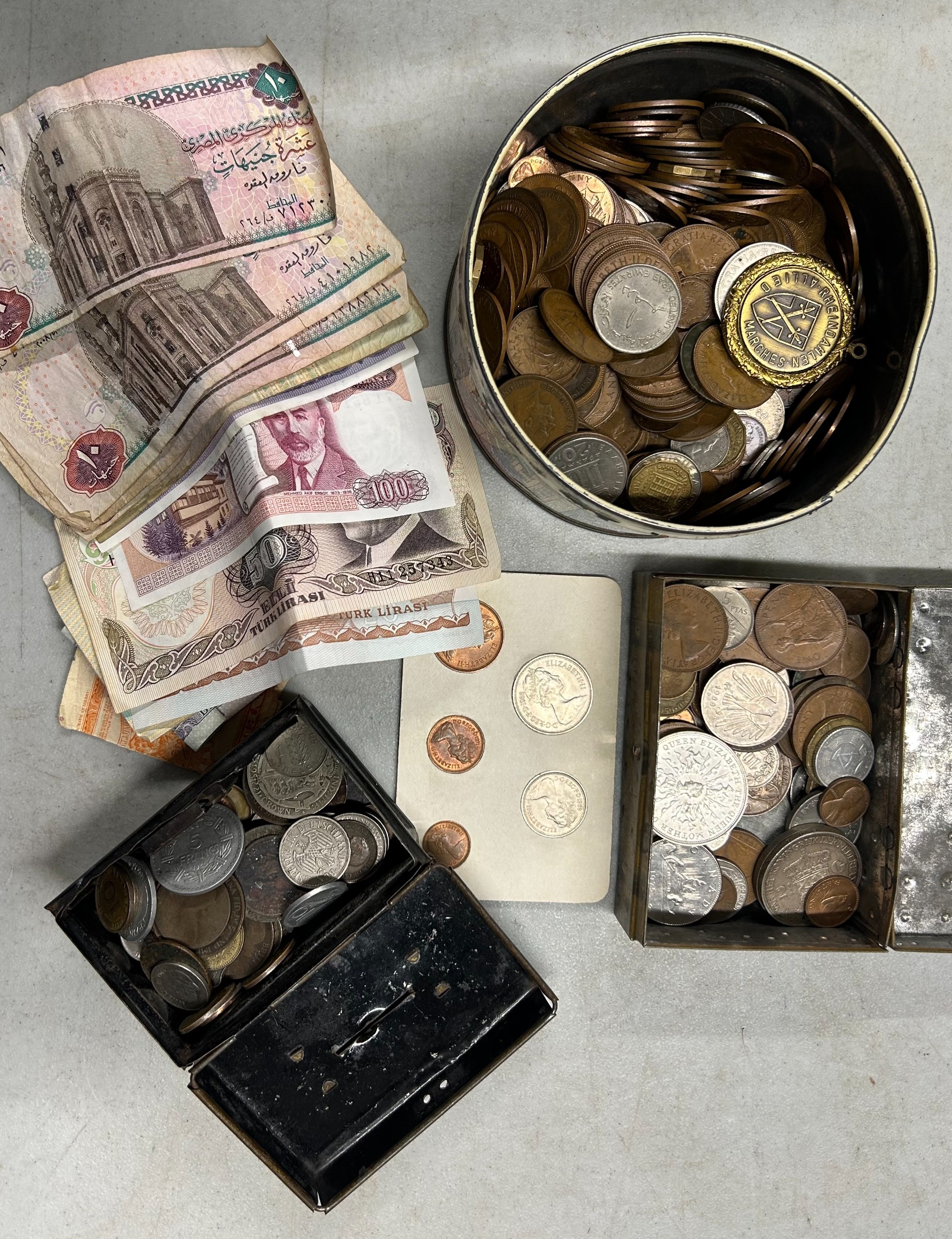 Approx. 2.4kgs assorted coins comprising British and world coins, mostly 20th century, and 17 assorted world bank notes. Average good condition to worn.
