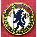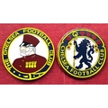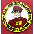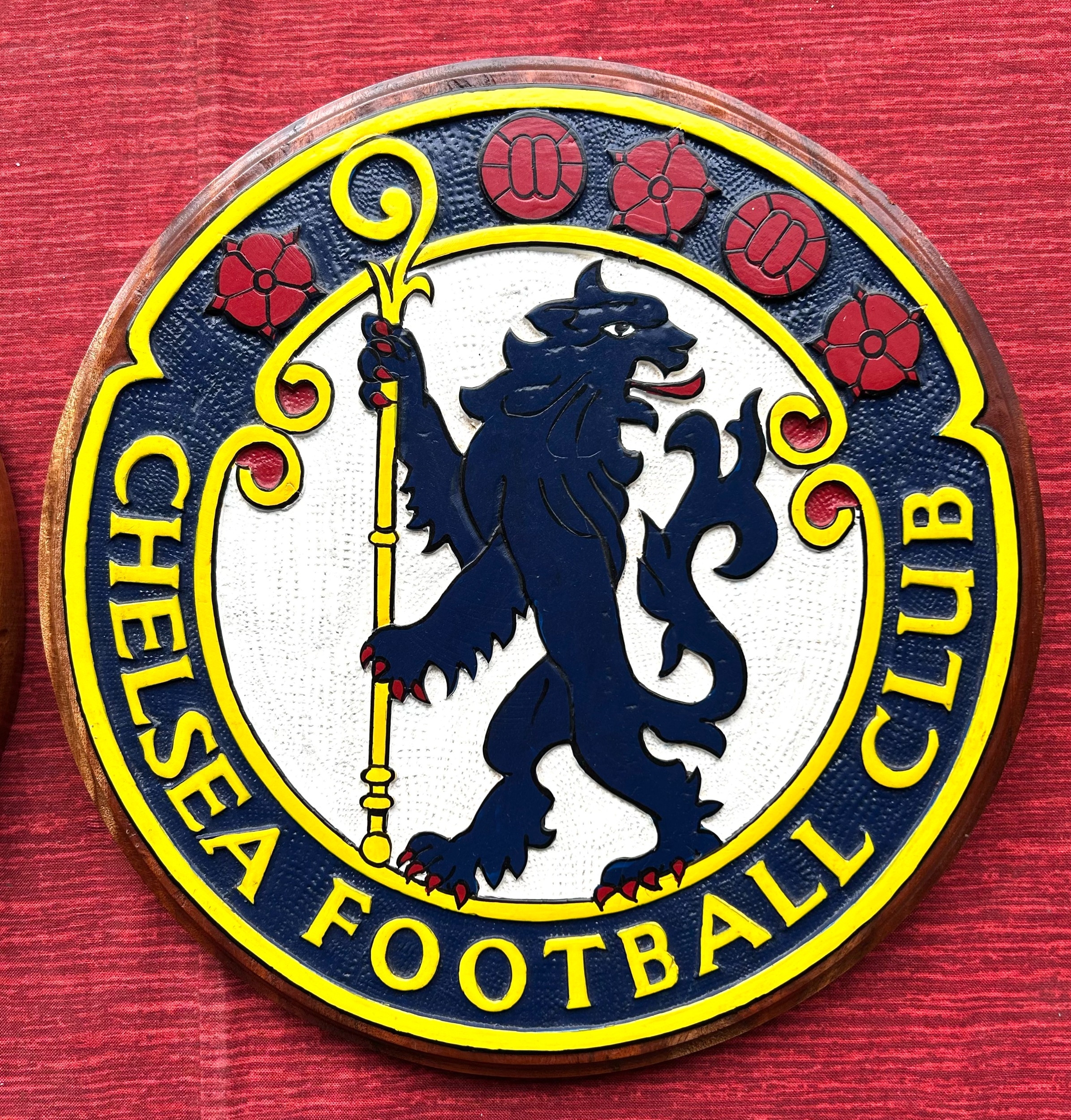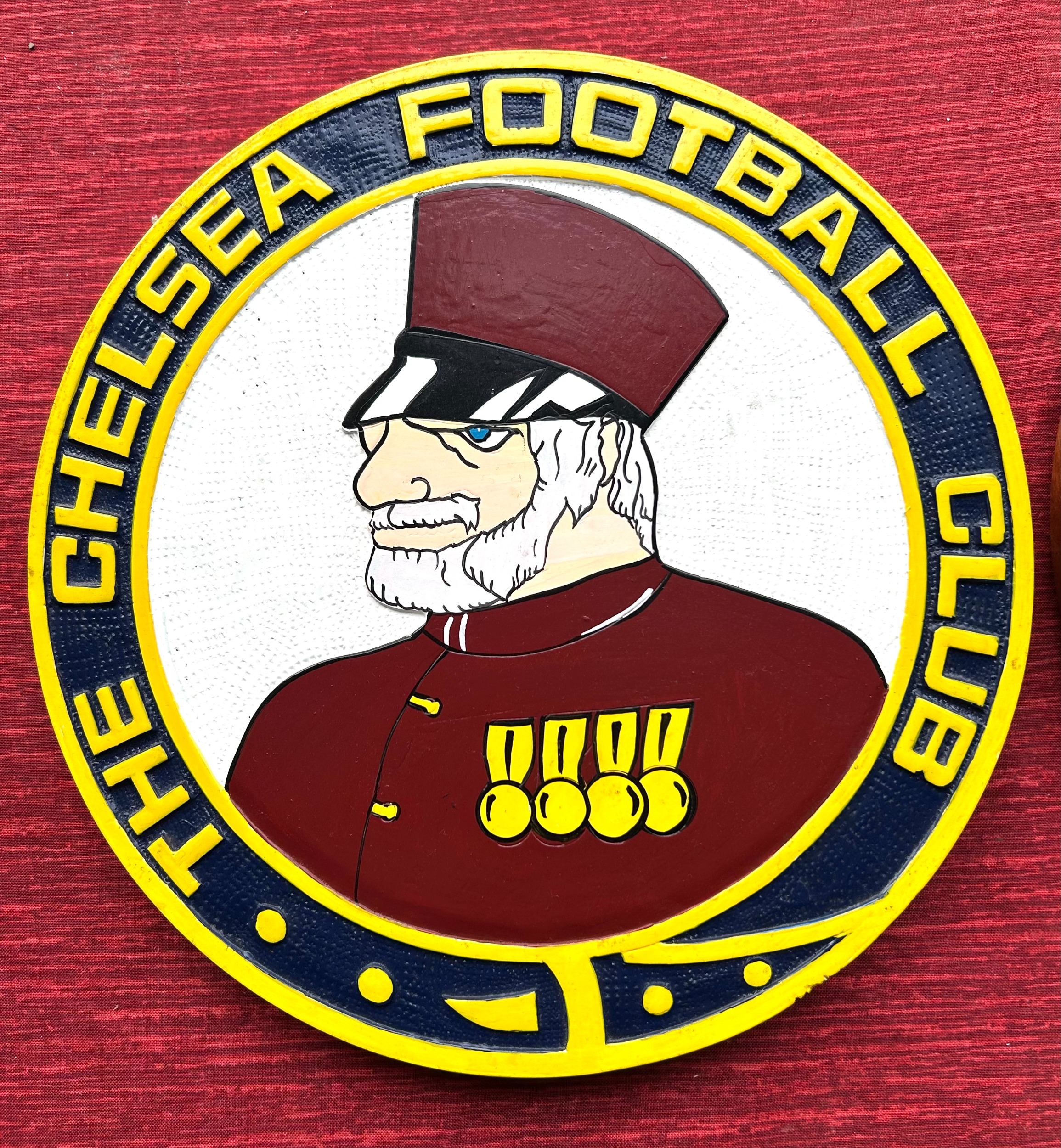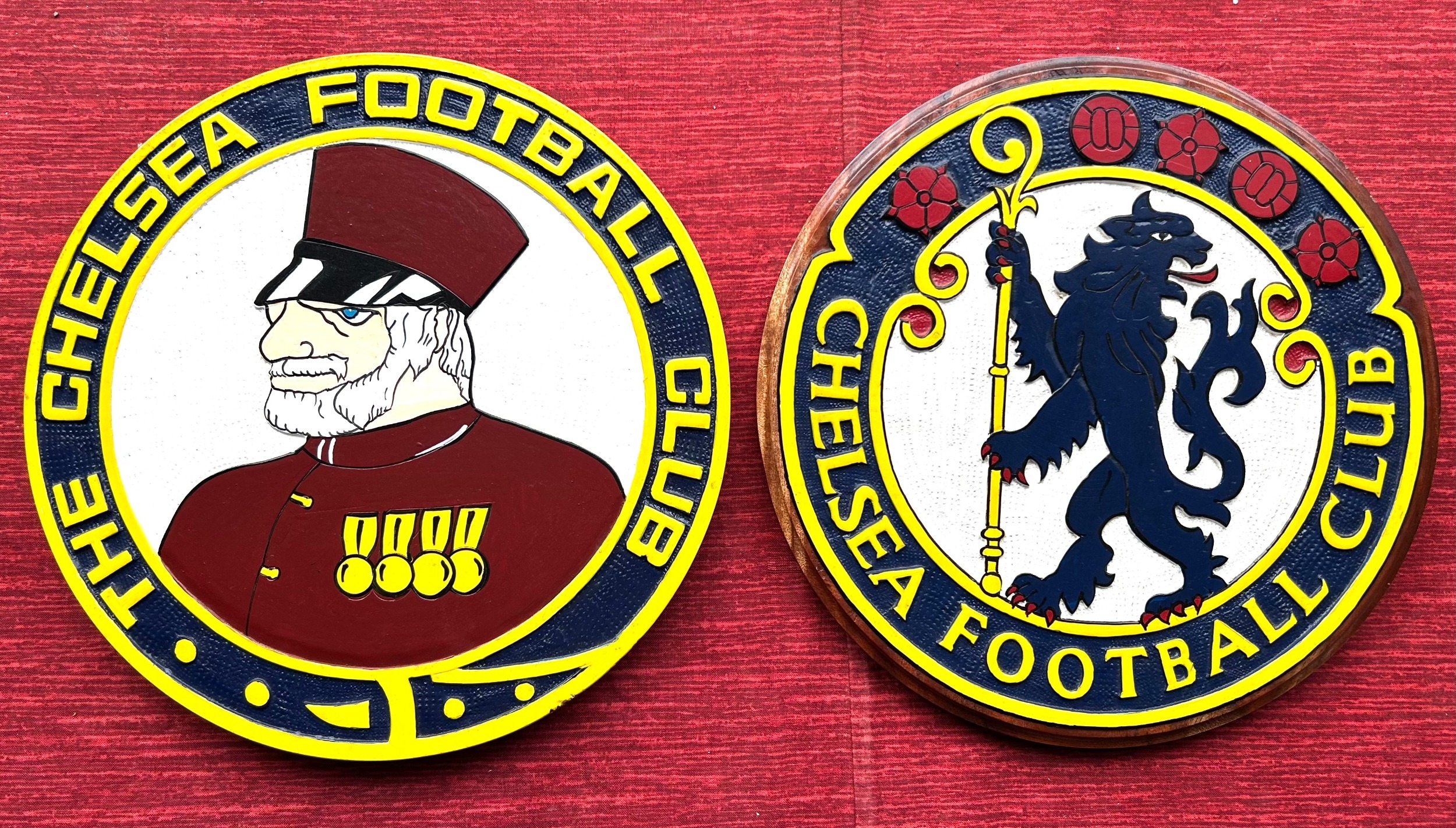 Football interest. CHELSEA F.C. circular wooden plaque depicting a Chelsea Pensioner with the words CHELSEA FOOTBALL CLUB TO THE BORDER. Looks hand made and painted, with another showing the CHELSEA F.C. lion mascot. Both can be hung or come with wooden display stands. Roughly 10" diameter. Very unusual possibly bespoke one off pieces. £50-70